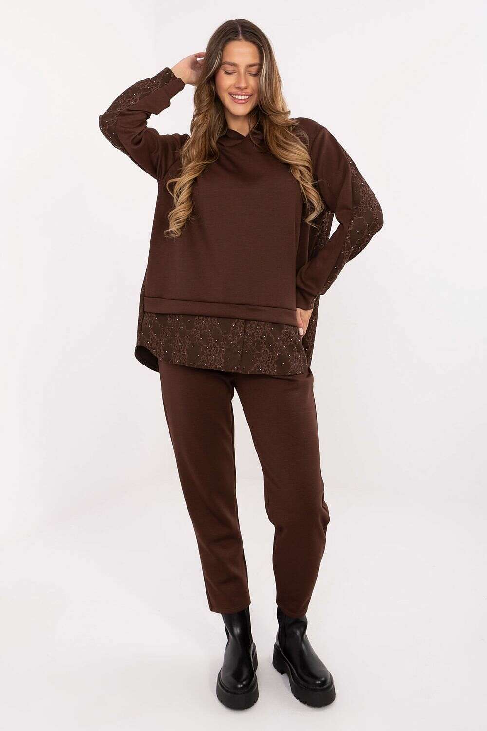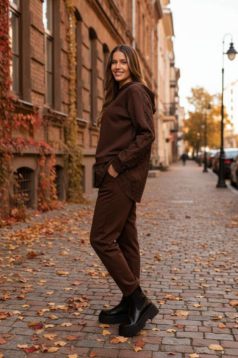 The hoodie stands out with decorative jet appliqué and lace inserts that trace the back, sleeves, and bottom front, adding a touch of feminine elegance to a casual silhouette. The pants feature an elastic waistband and practical side pockets, while the long tapered legs provide a flattering, streamlined look.