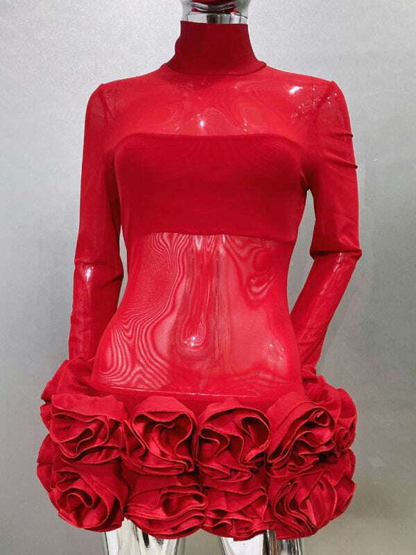 Sexy see-through mesh flower bud skirt ultra-short red dress sexy hot birthday party dress