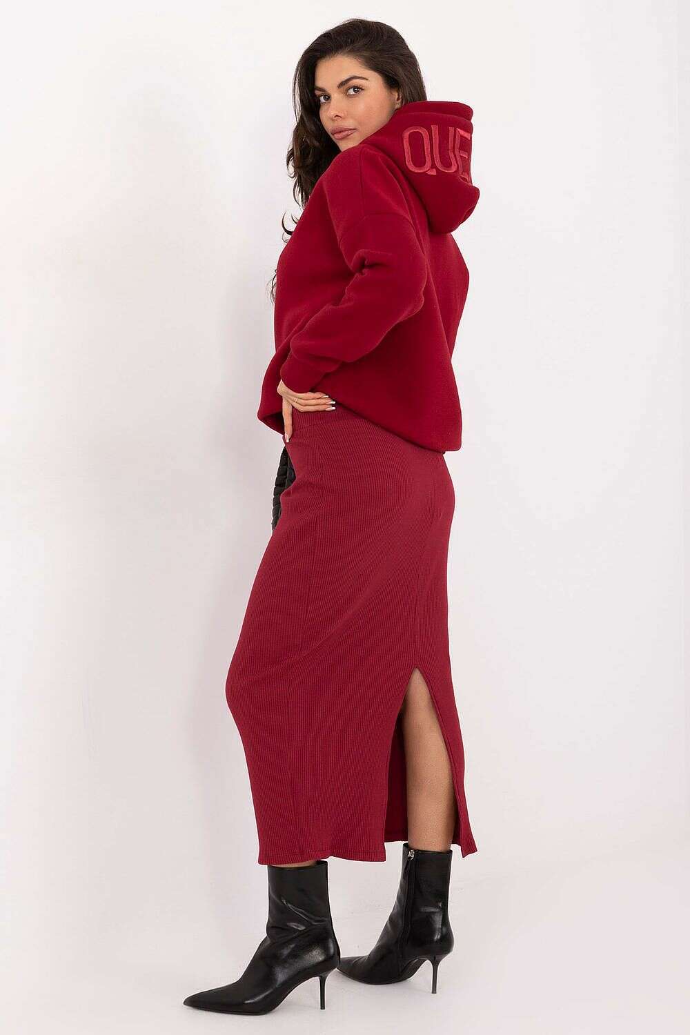 Casual Midi Length Knit Skirt 220410 is designed for everyday comfort with a modern silhouette. Made from a soft cotton-elastane blend, it hugs your curves while allowing freedom of movement. The ribbed, smooth fabric subtly flatters the figure, and the back slit adds a feminine touch while keeping the look relaxed.