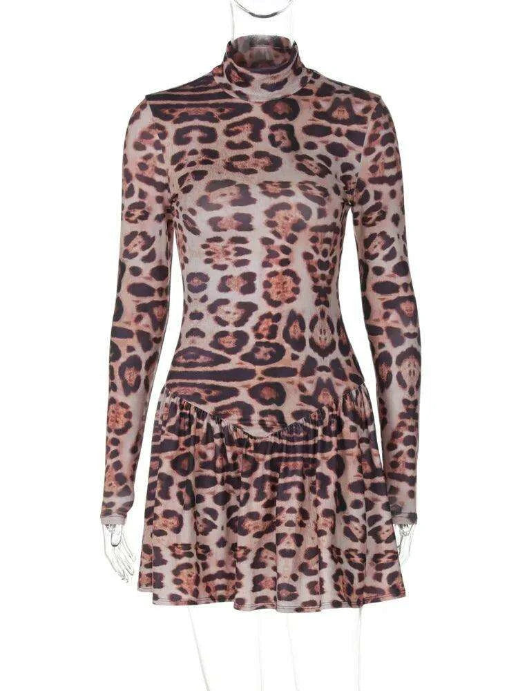 Sleek Leopard Print Bodycon Mini Dress with Turtleneck for Women