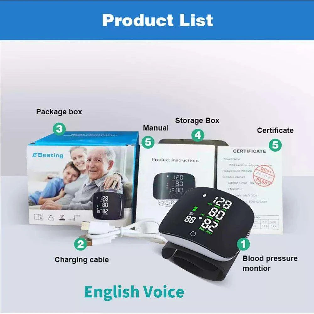 Voice-Activated Rechargeable Wrist Blood Pressure & Heart Rate Monitor with LCD Display