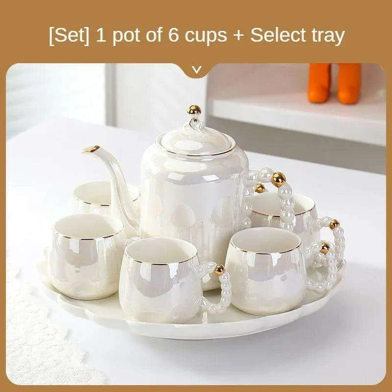 Elegant Pearl Ceramic Tea and Cold Beverage Serving Set with Coffee Pot and Cups