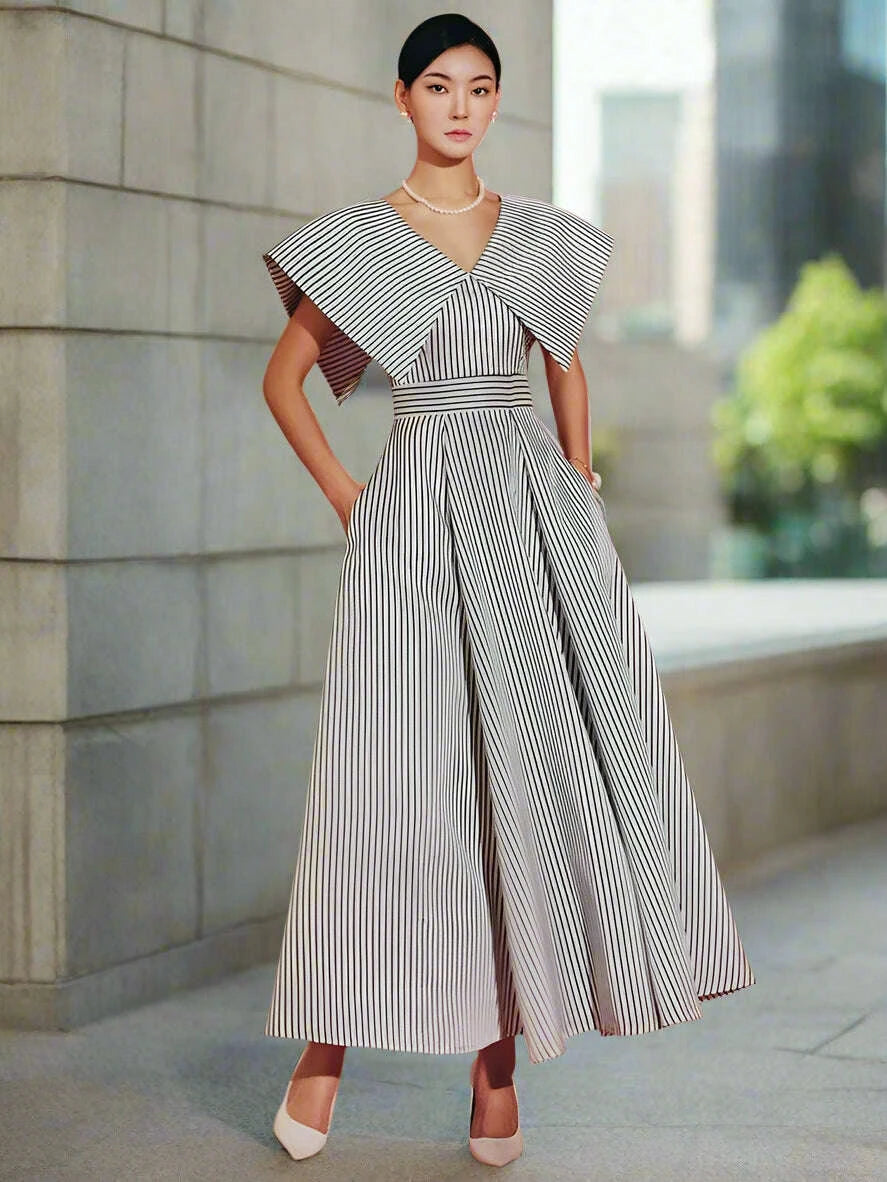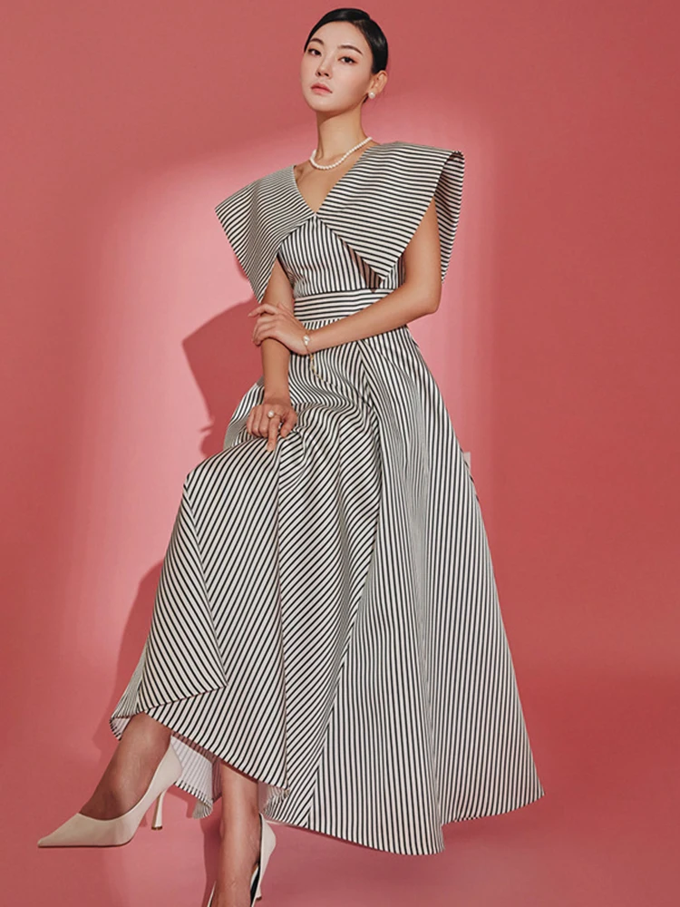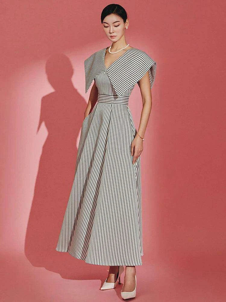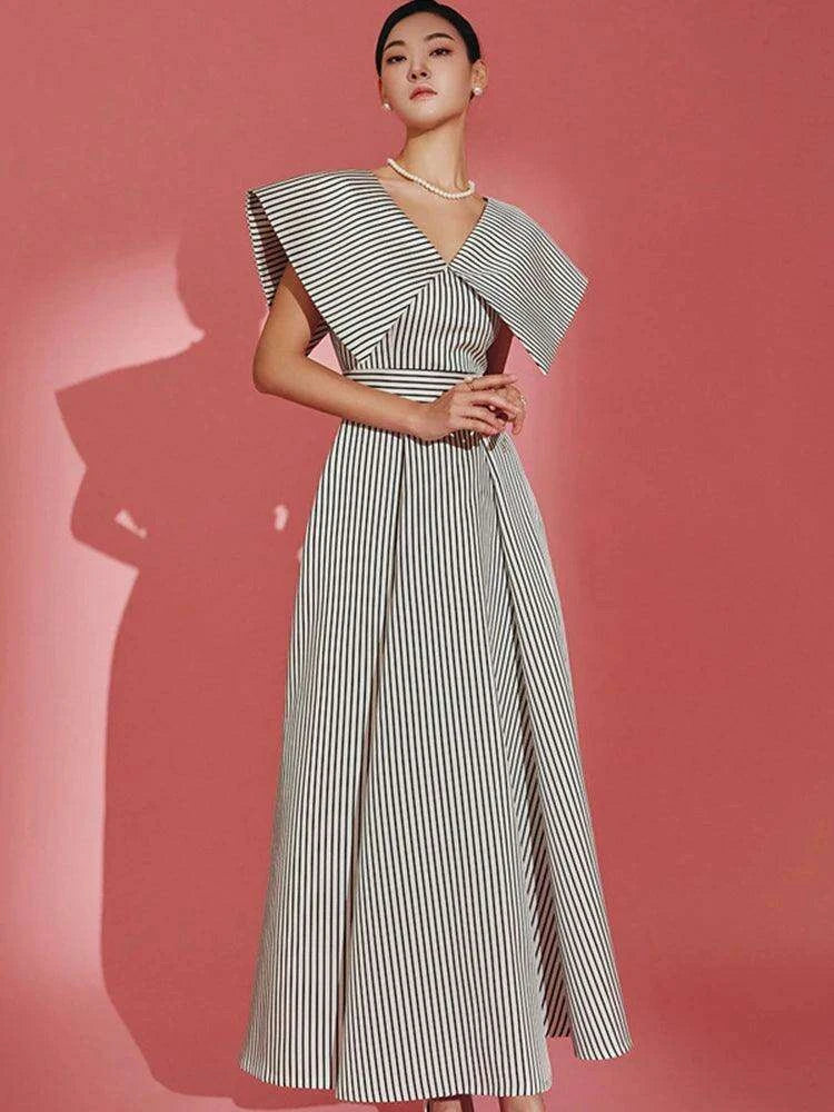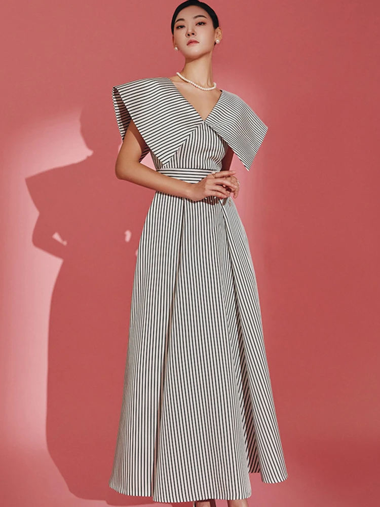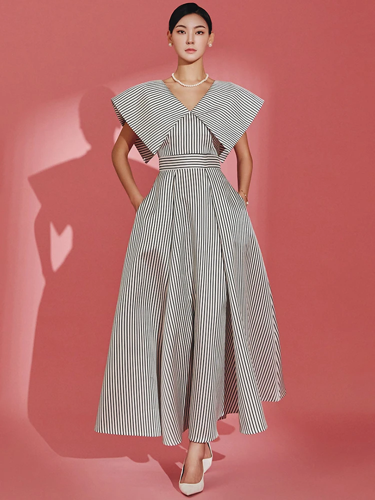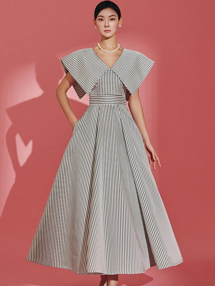 Striped High-Waisted Evening Dress with Oversized Collar for Women – 2024 Summer Collection 35Z657