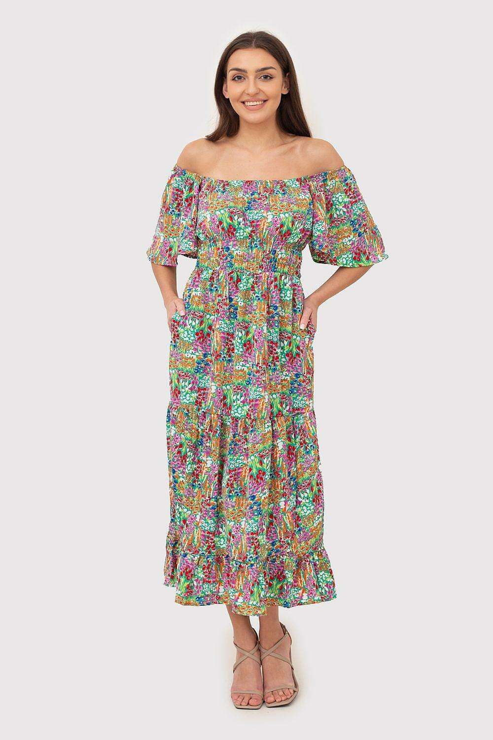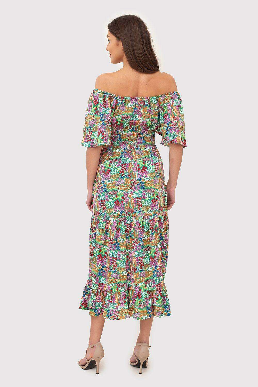 Floral Elegance Bardot Midi Dress - Ruffled Summer Daywear