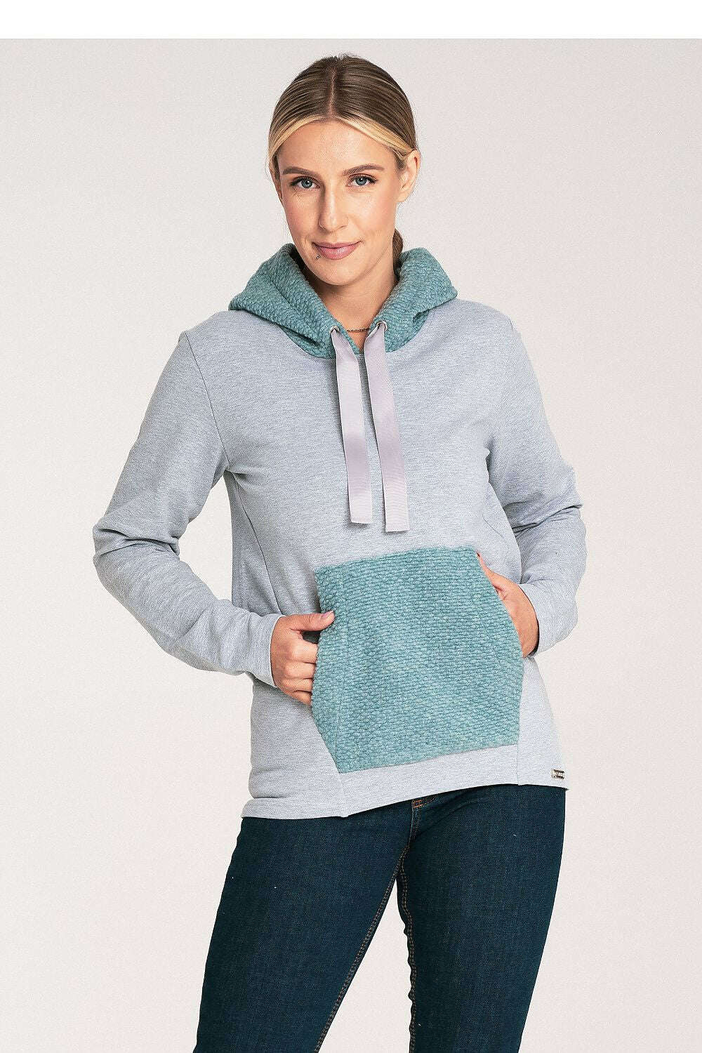 Cotton sweatshirt with long sleeves and a loose hood in wool. Sewn-on wool kangaroo pocket on the front.