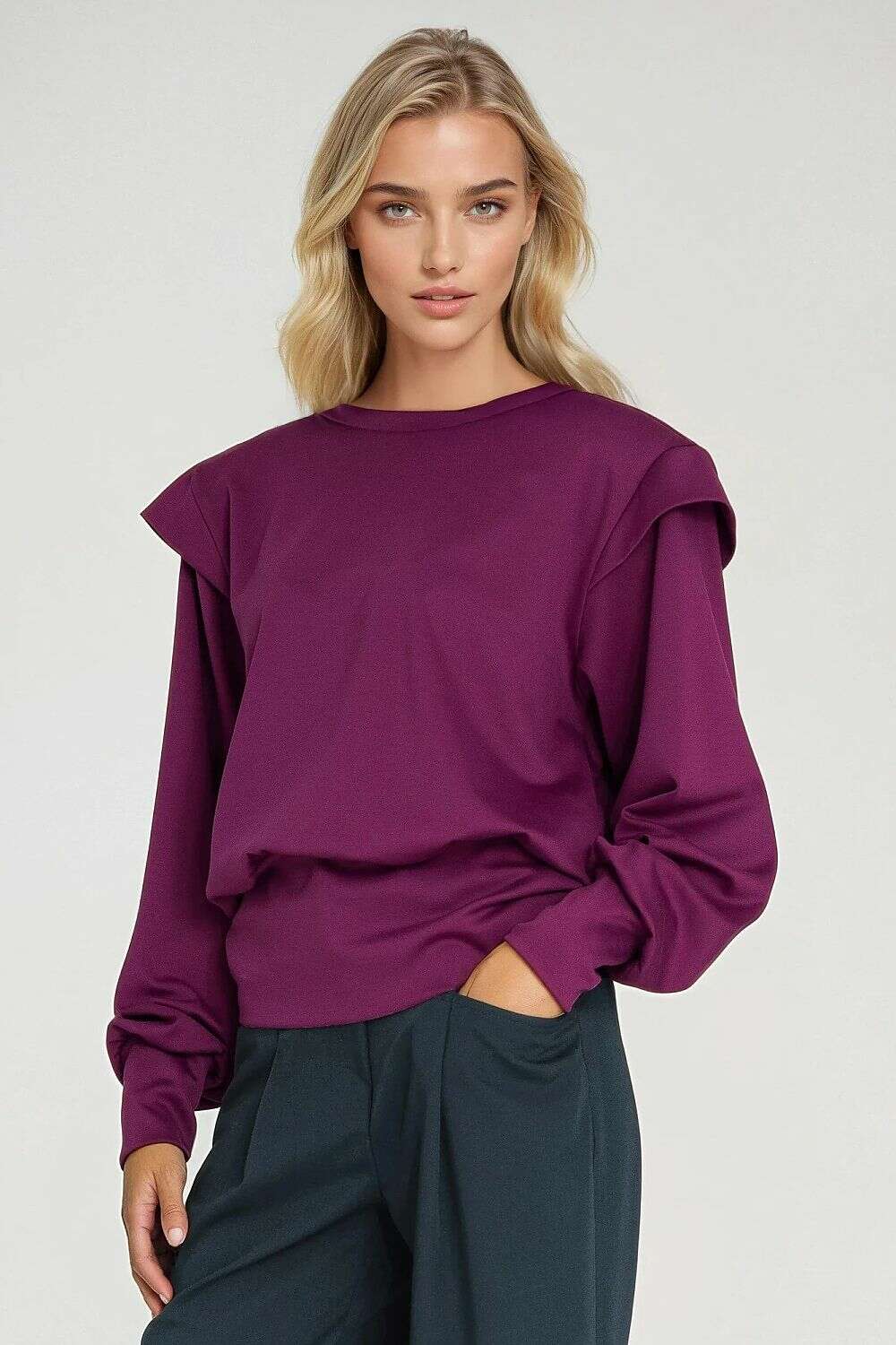 Elevate your casual wardrobe with this Women’s Oversized Sweatshirt featuring shoulder pads for a subtle, sculpted silhouette. The round neckline and dropped shoulder line create a modern, relaxed vibe, while wide cuffs and a high bottom cuff deliver a sporty-chic finish. Designed to be pulled over the head for effortless wear, this sweatshirt drapes beautifully on the figure and pairs perfectly with your favorite denim, leggings, or a sleek skirt for versatile styling from everyday to elevated looks.