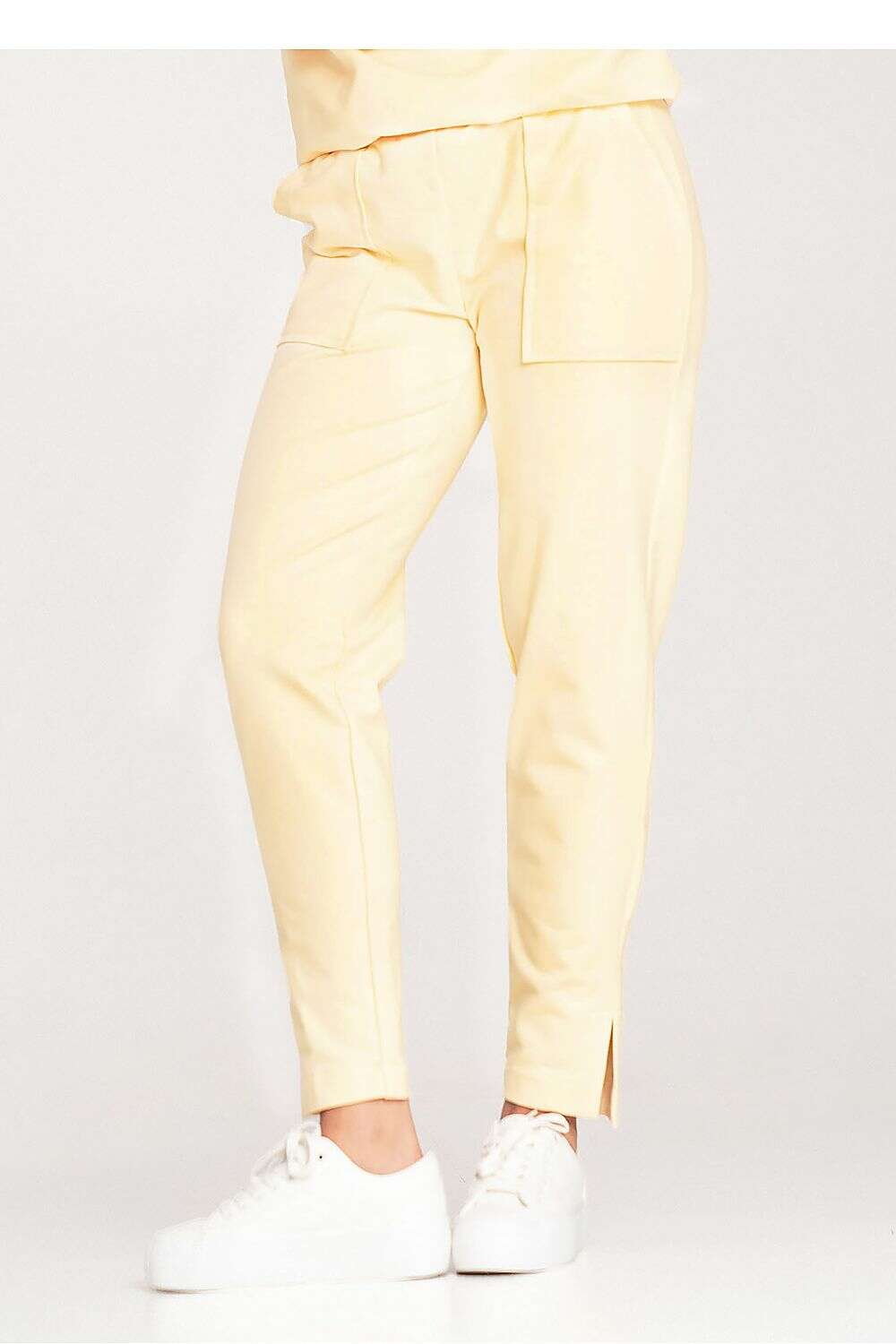 Cotton sports pants for women. Sewn into the waist with a wide, crinkled elastic band. The legs are tapered to the bottom, with a slit at the bottom. Large patch pockets on the front.