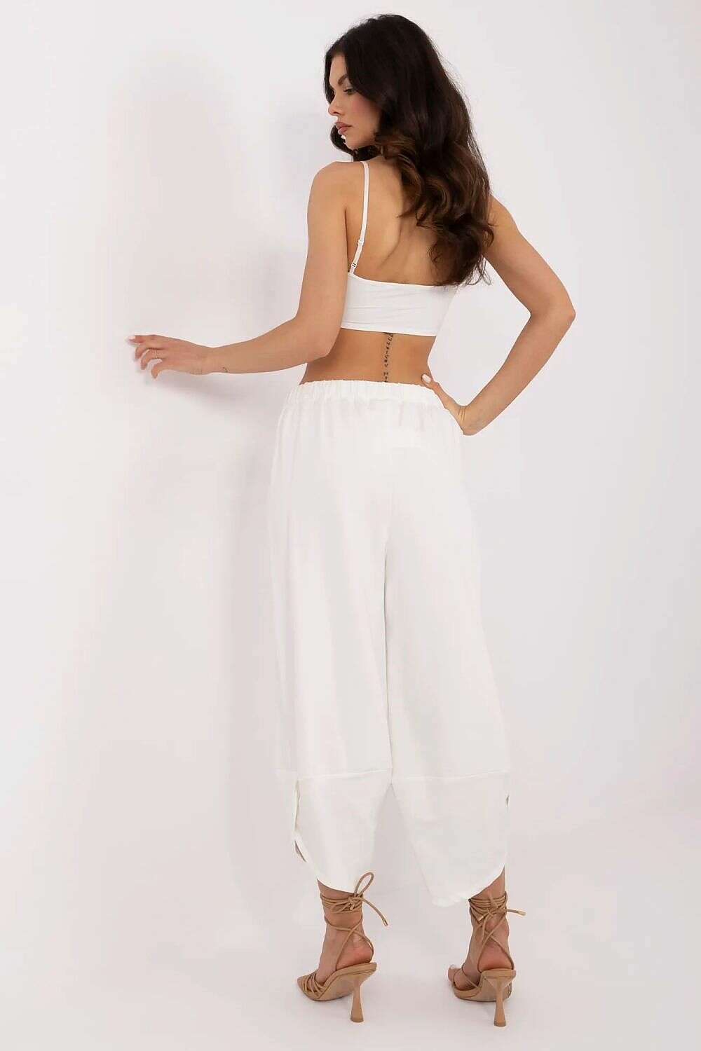 Women's casual Aladdin-style sweatpants, perfect for everyday wear. Made of a soft and stretchy blend of cotton and elastane, they provide comfort and freedom of movement. The high waist with inserted elastic ensures a comfortable fit to the silhouette. The smooth material and loose fit give them lightness, while stylish slits on the legs add an original touch. Practical, slip pockets sewn on the sides increase functionality. An excellent choice for women who appreciate comfort and a fashionable look!