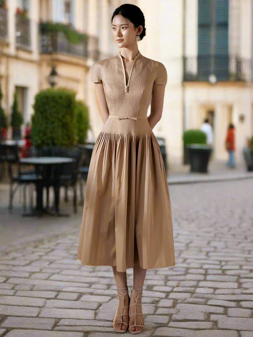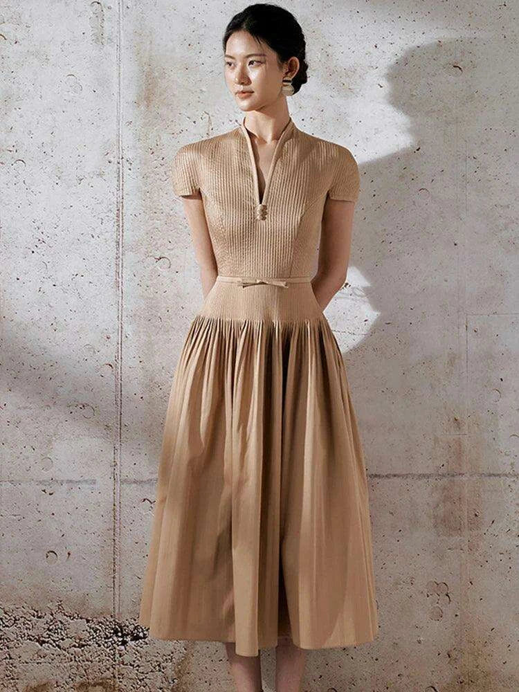 V-neck Bowknot High-Waisted Pleated A-line Evening Dress for Women