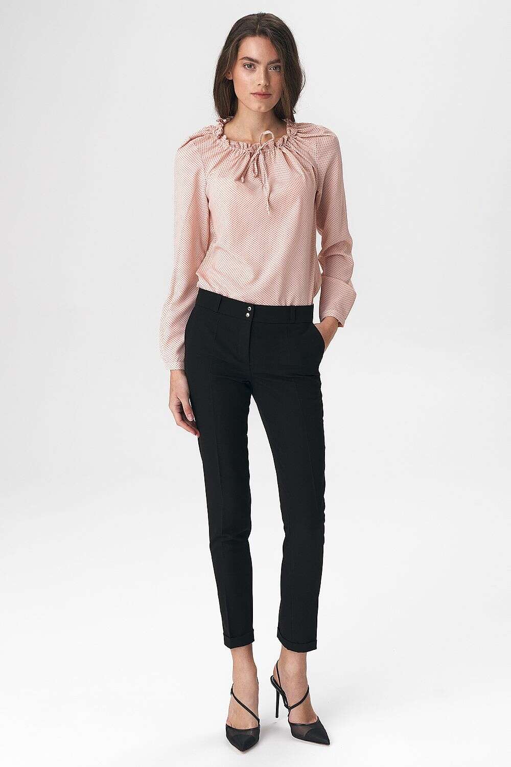 Black trousers fastened with snaps will look good in many office fashion stylizations. The tailored cut emphasizes feminine shapes, and the snap fastening is an accent breaking the formal style. The pleasant to the touch material, with a touch of viscose, ensures high comfort of wearing.