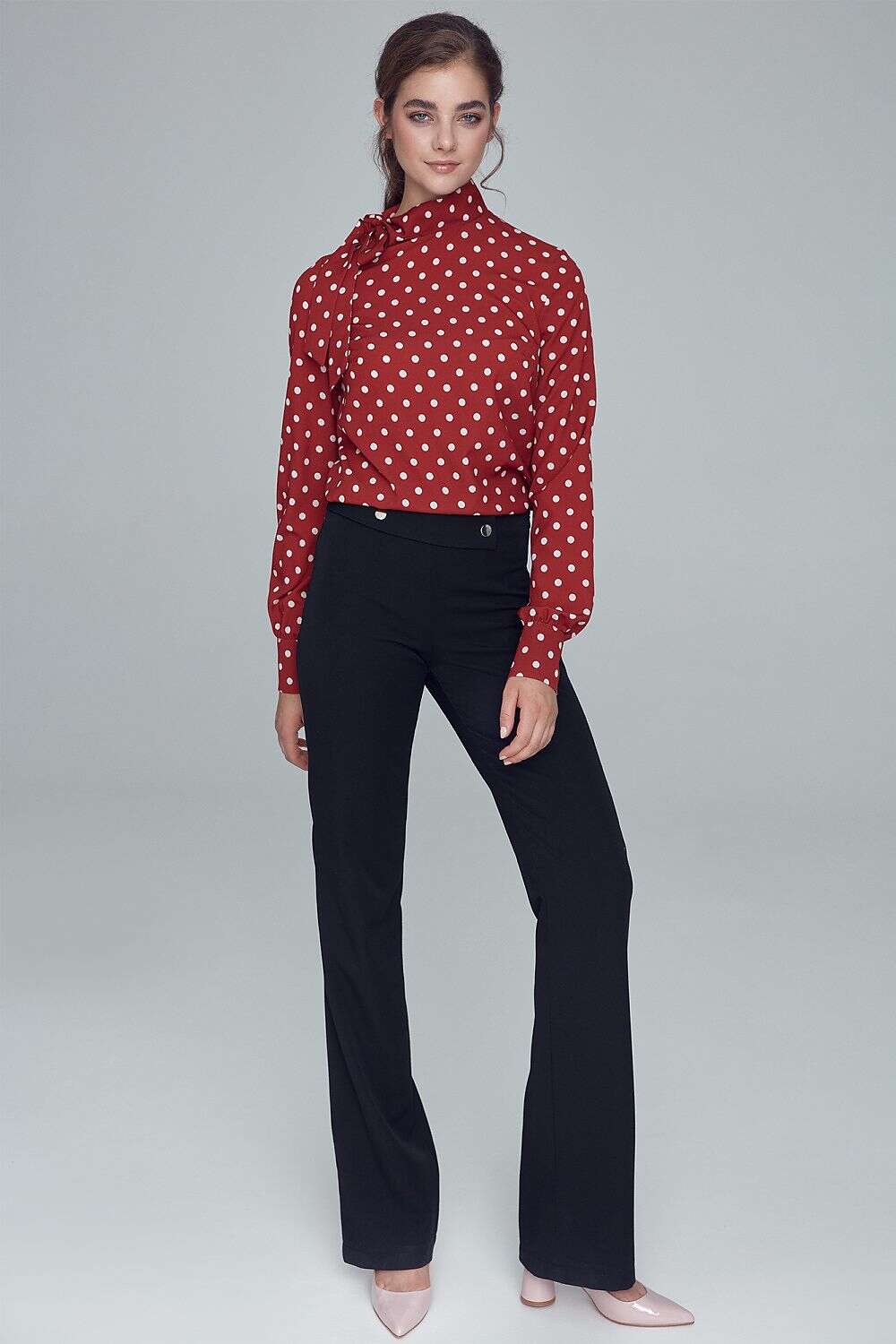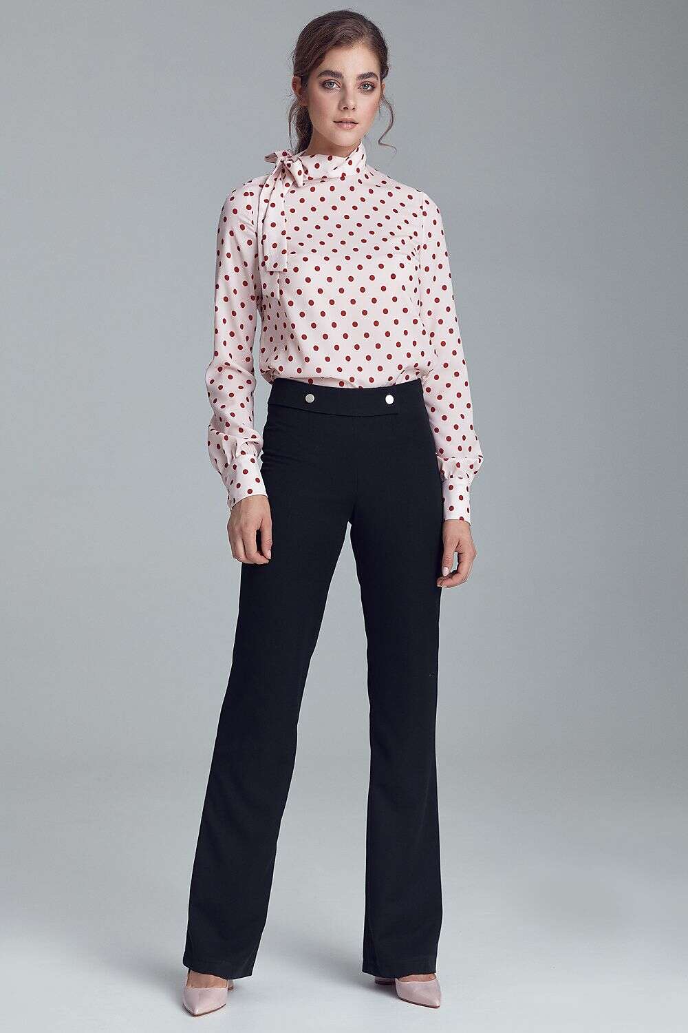 Stylish women's trousers in a soft office style with a simple cut and decorative buttons on the belt. The model creates a complete suit together with an elongated blazer. Black trousers also look great solo or paired with a shirt or a light, autumn sweater.