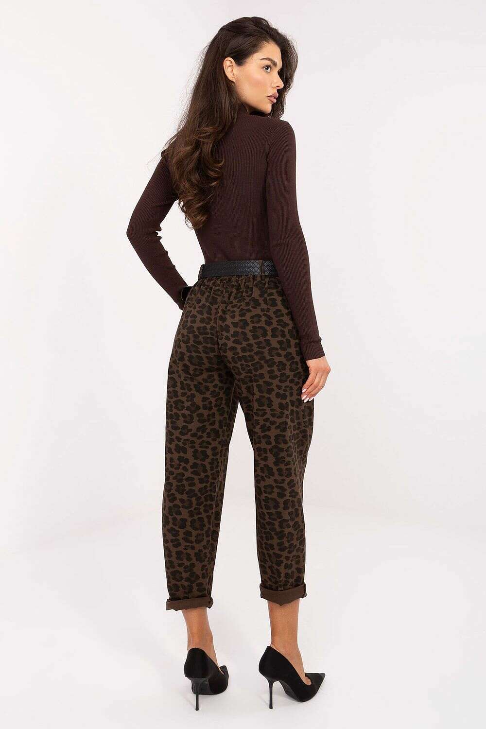 Women's casual fabric pants, perfect for everyday wear. Made from a blend of viscose, polyester, and elastane, they combine comfort with flexibility and durability. The high-waisted model with tapered legs and an elastic waistband ensures comfortable wear, while the fastening belt accentuates the waist. Side slip pockets and a trendy animal motif throughout the material give the pants a modern, distinctive character.