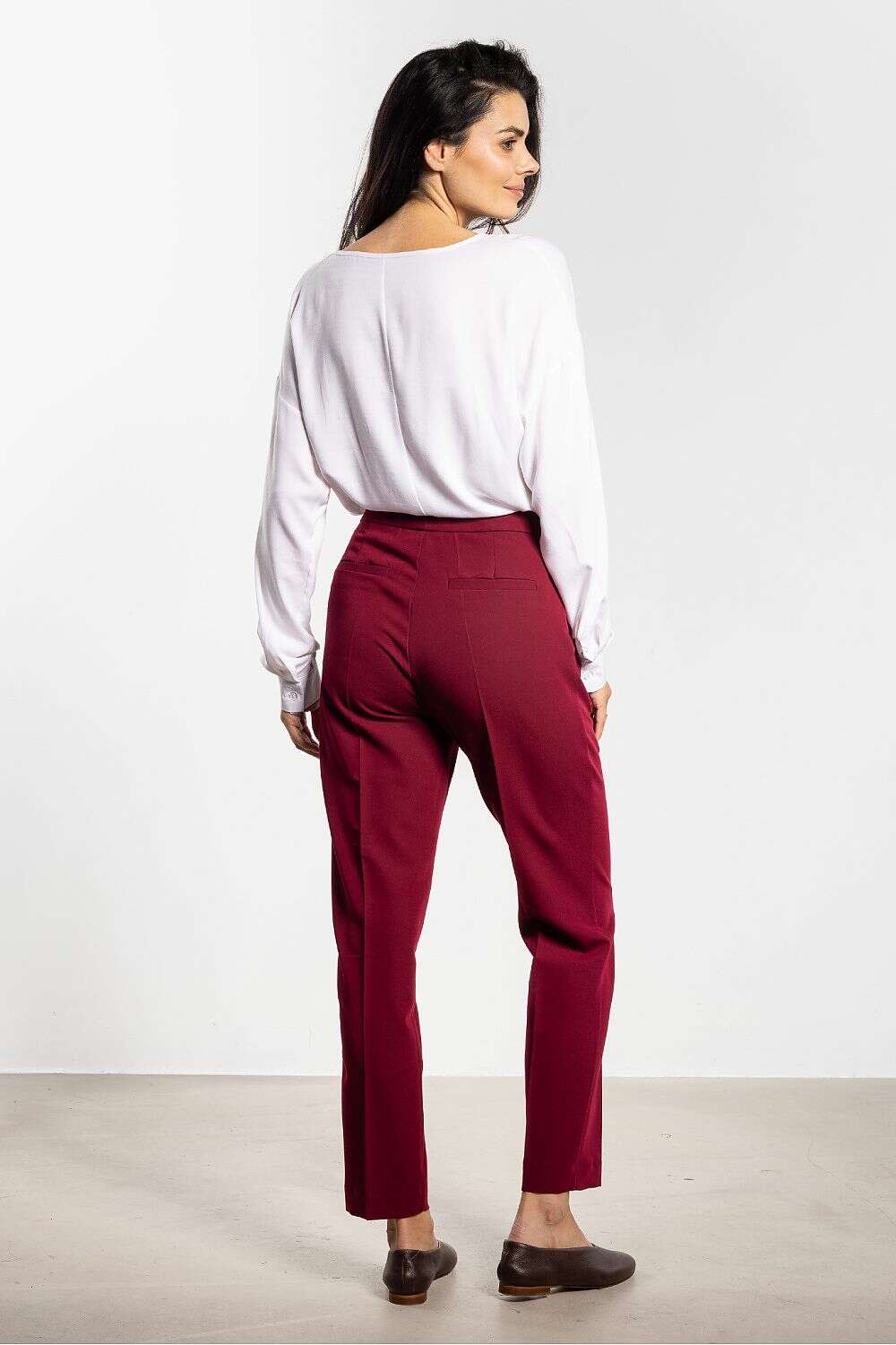 Women Cigarette Trousers Model 218976 With High Waist combine timeless elegance with modern tailoring for a versatile wardrobe essential. The classic cigarette cut features a sharp crease that visually slim the legs and harmonizes proportions, while the high waist beautifully defines the silhouette. The ankle-length adds a light, contemporary note, making these trousers perfect for both polished office looks and sophisticated evening outings.