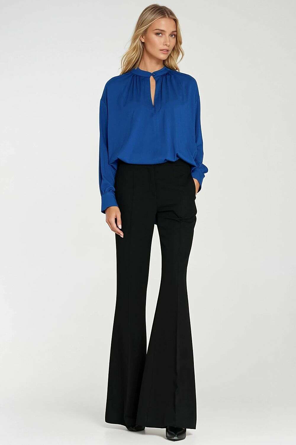 Discover timeless elegance with Women Bootcut Trousers With Medium Waist And Crease. A fitted cut at the waist and hips enhances your silhouette while the fabric drapes with sophistication. The leg widens from the knee to create a flattering bootcut that lengthens the look of your legs, delivering a modern, feminine silhouette. Front and back creases add chic structure and a professional expression to every outfit. Complete with a zip and button fastening and classic front pockets, these trousers transition seamlessly from office wear to refined everyday ensembles.