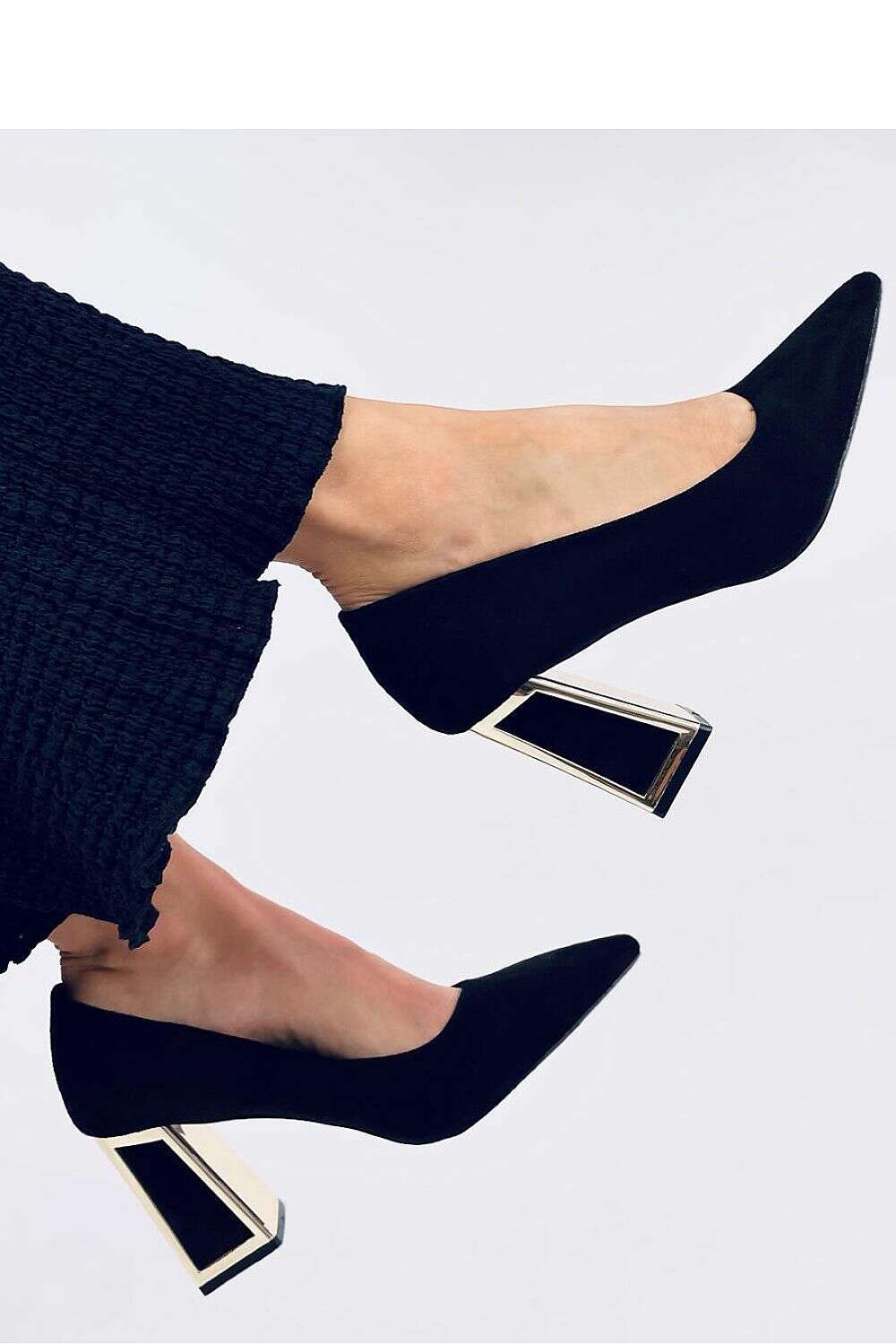 Women's suede pumps on a geometric heel with a height of 9 cm. Their graceful cut combined with gold inserts gives a unique effect.... They look beautiful on the leg! If you want to look unique and enjoy comfort then you must have them - they have an inner insole made of natural leather : ) Outer material - ecological suede.