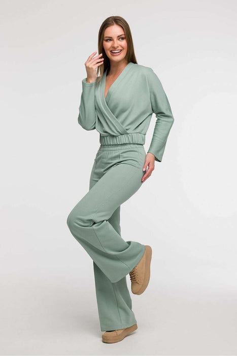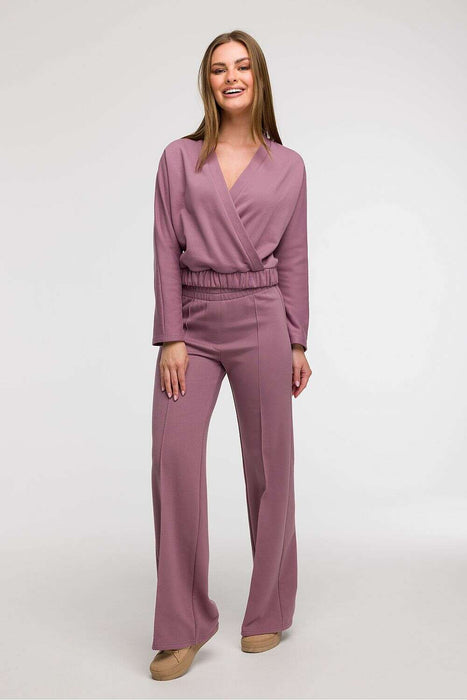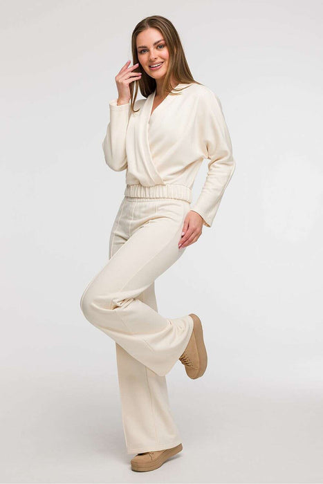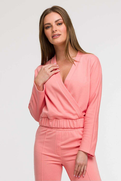 This women's wrap-style blouse is a combination of comfort and elegance, perfect for everyday wear as well as holiday getaways. Made in Poland with attention to detail, it features a front wrap in the shape of a V, subtly emphasizing the neckline and adding lightness to the entire silhouette. The fit is loose in the shoulders and chest, and thanks to the elastic waistband, the blouse harmoniously adjusts to the body, accentuating feminine shapes. This cut makes the model particularly well-suited for pear-shaped figures, balancing proportions between the top and bottom. The waist-length and long sleeves make it functional and easy to style, both in a casual and elegant version.