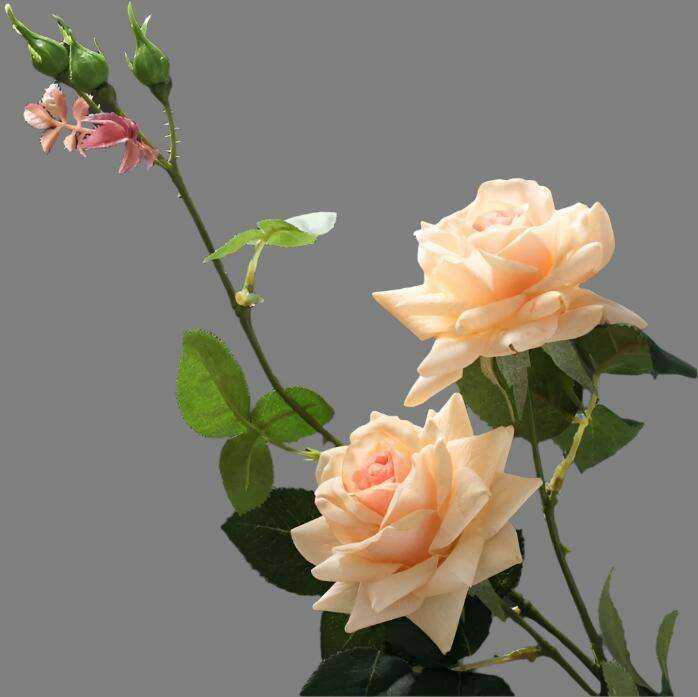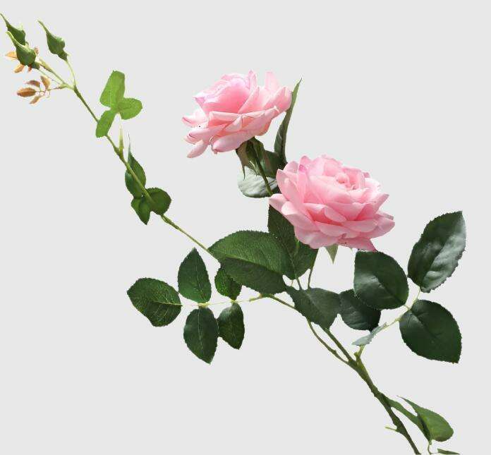 Le matériau principal utilisé pour créer ces roses artificielles est le tissu de soie, ce qui leur confère un effet hydratant. Ils mesurent 89 cm de haut et ont deux fleurs d'environ 7,5 cm de diamètre chacune.
