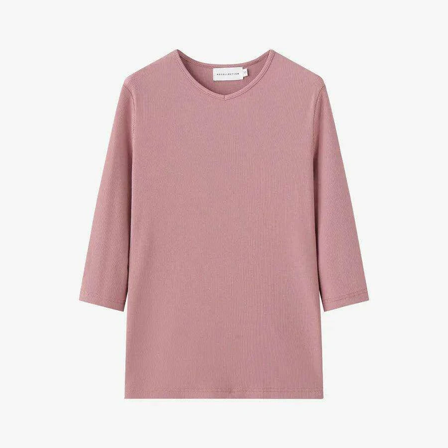 3/4 Sleeve V-Neck Women Tops with High Stretch Ribbing Fabric