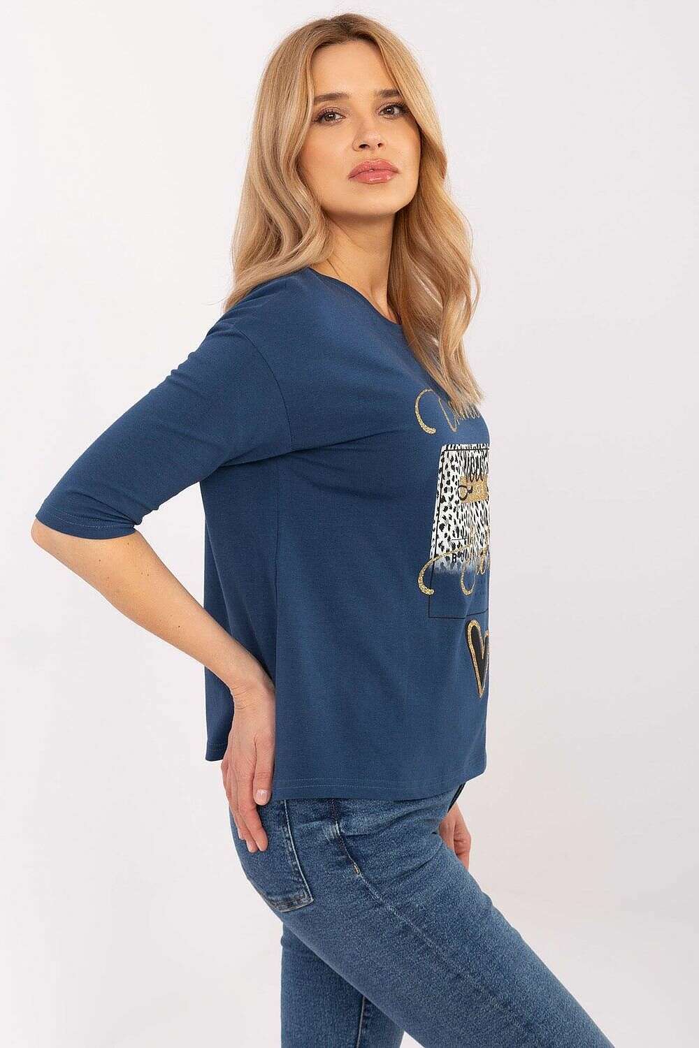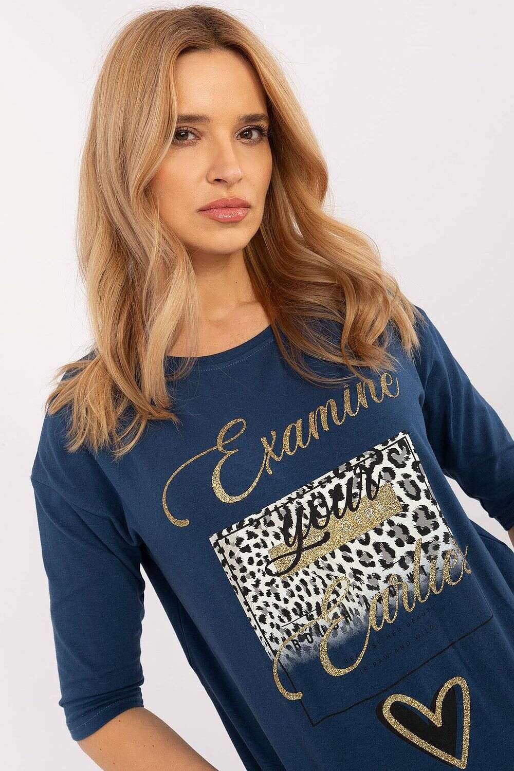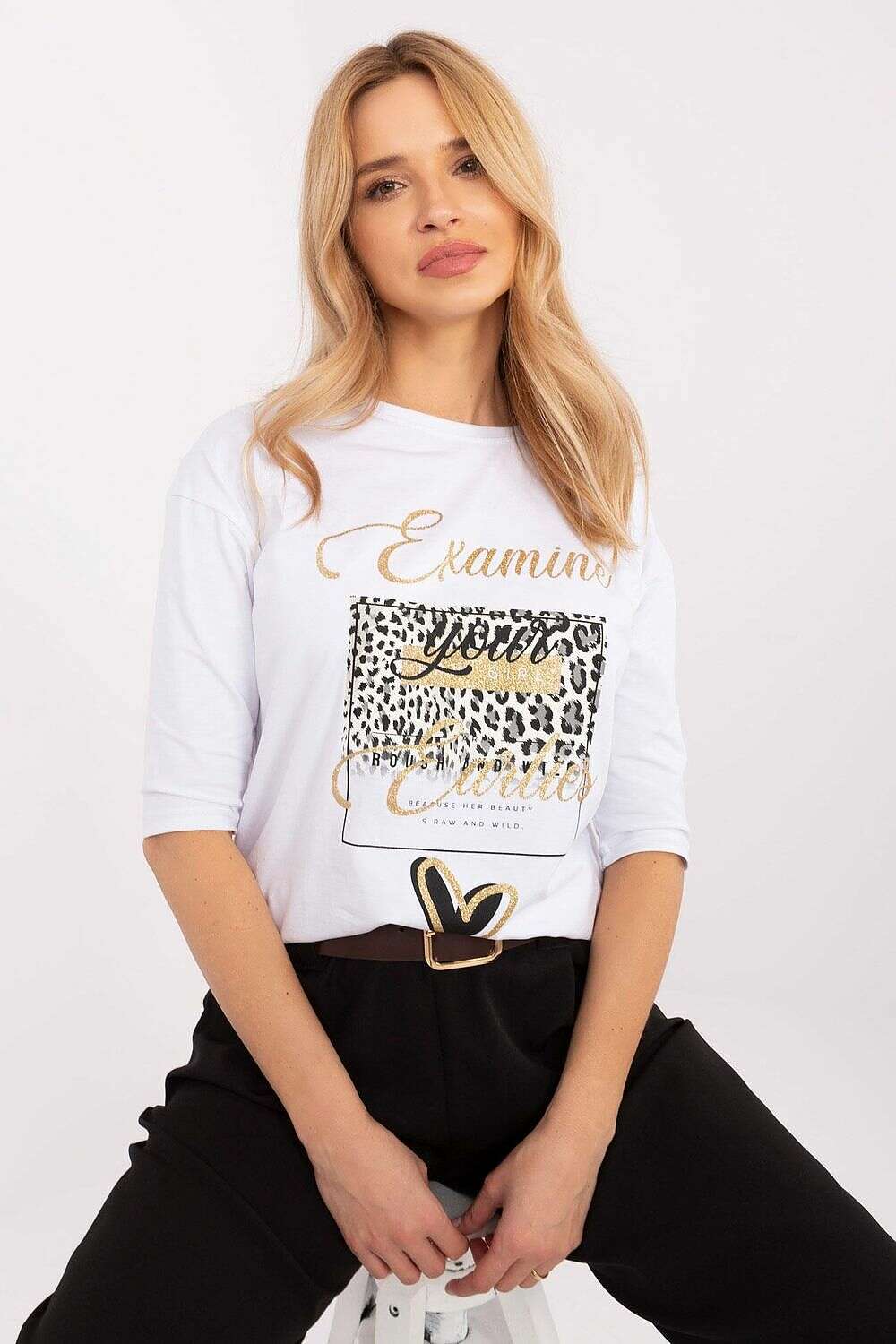 Stylish everyday blouse of standard length, made of soft cotton with elastane for comfort and perfect fit. The model with 3/4 sleeves and a round neckline is a universal proposal for any occasion. The dominant pattern combines a print with an animal motif on the front, giving the blouse a fashionable and distinctive character. Excellent for casual stylizations, it goes well with both jeans, skirts, or elegant trousers.