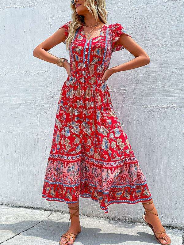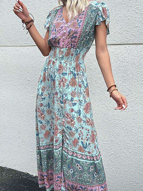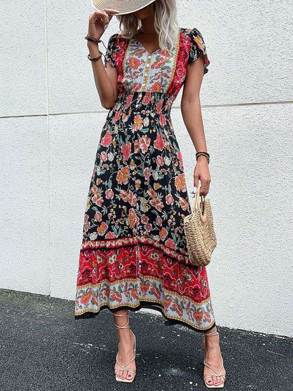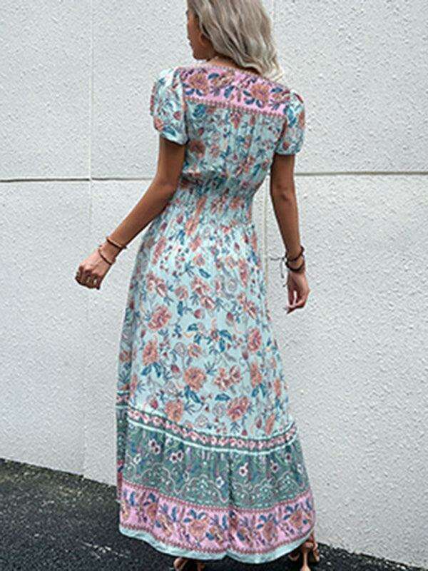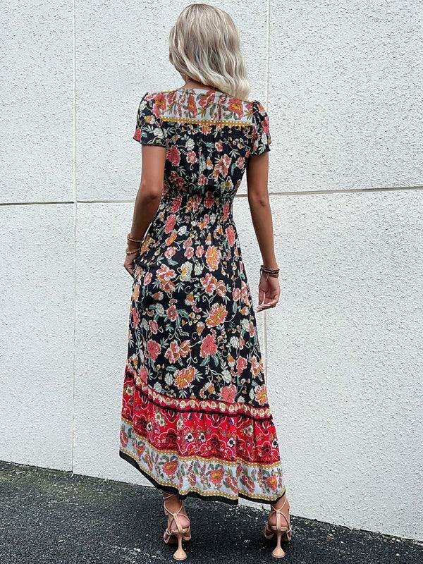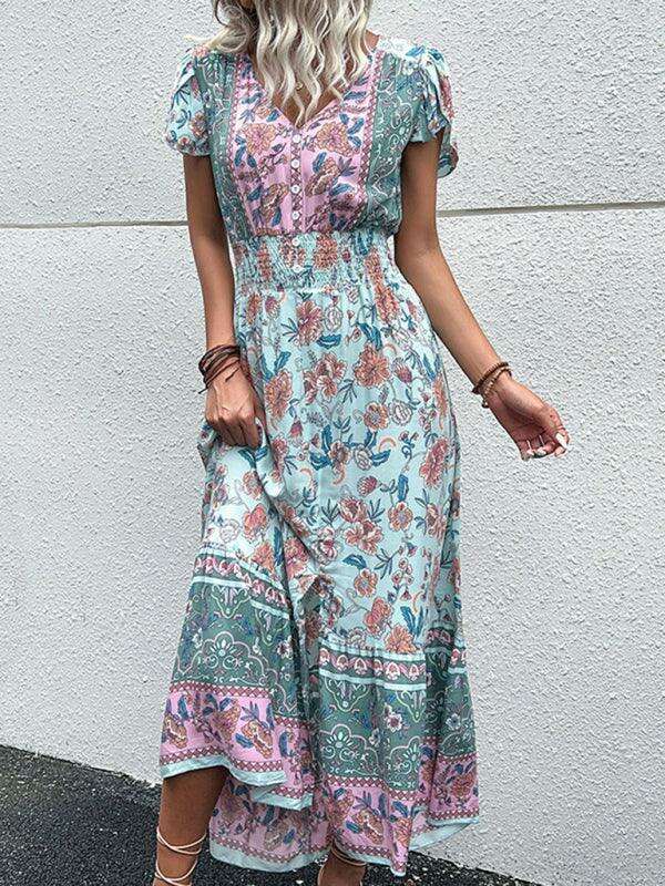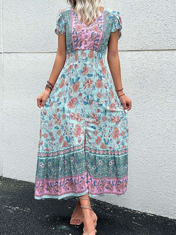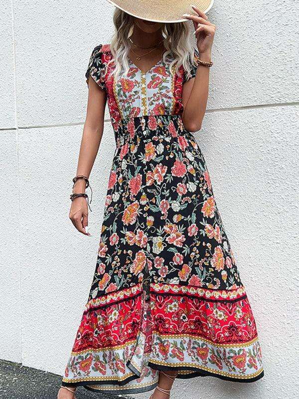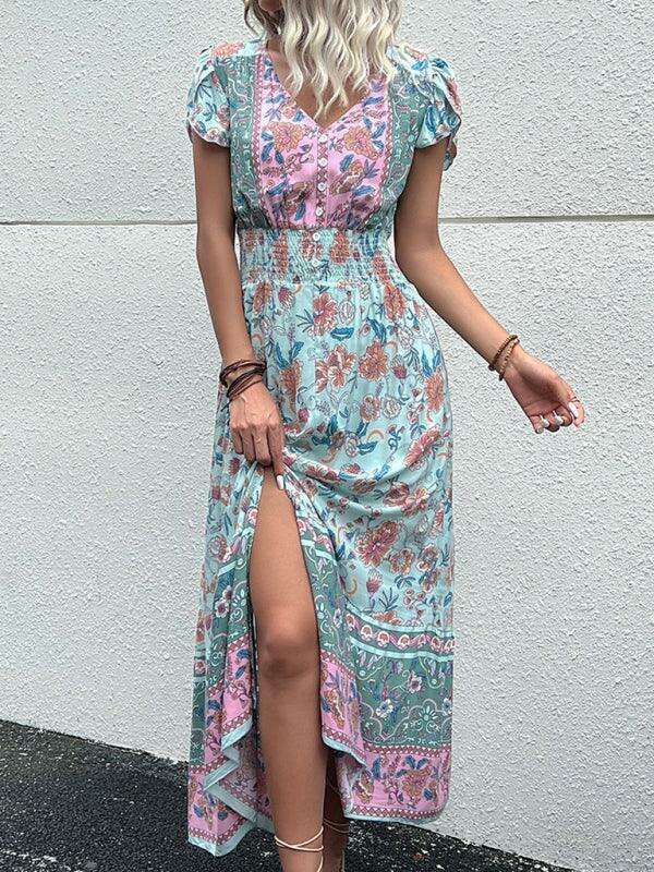Boho Chic Floral V-Neck Rayon Dress with Slit for Women