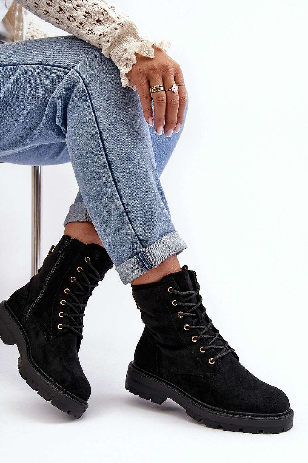 Classic women's ankle boots made of eco suede. Set on a platform and flat heel. This model is fastened with a zipper and also has lacing. Rounded toes. Stiffened heel counter will allow for proper foot stabilization. At the back of the shaft there is a short strap with a buckle. You must have them!