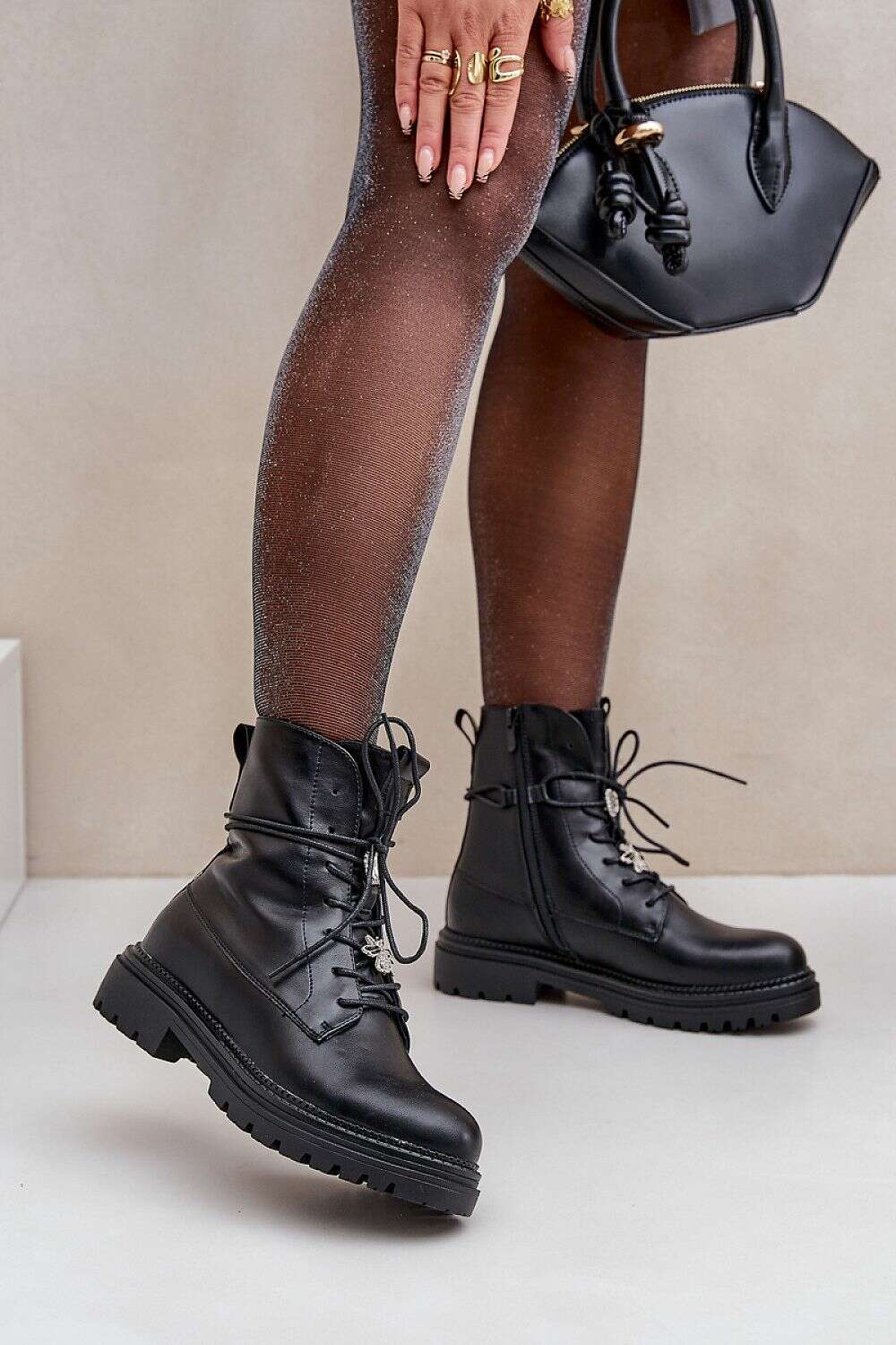 Boots made of eco leather with a flat heel are a perfect choice for cooler days. The model stands out with rounded toes and lacing, decorated with fancy pins that add a unique charm. The interior lined with shoe lining provides warmth and comfort when worn. Practical and fashionable, perfect for everyday styling!