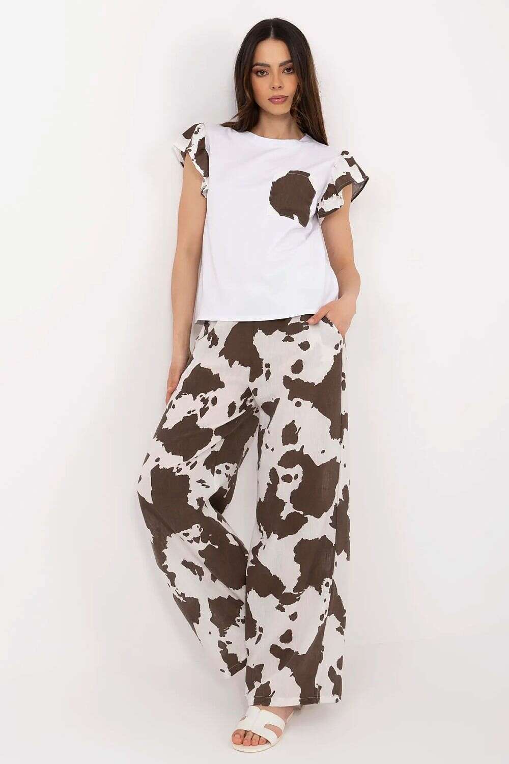 Introducing Set model 212522 — a stylish women's set designed for everyday outings, combining comfort with a contemporary, on-trend look. The ensemble features a blouse and wide-leg pants in a coordinated brown palette that suits year-round wear.