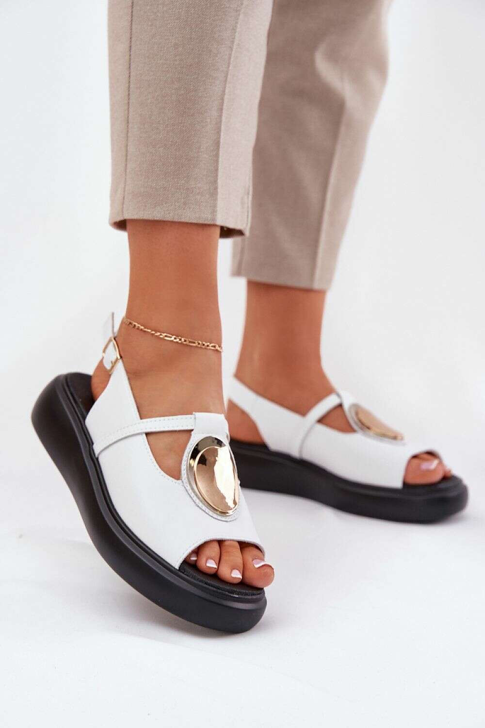 Women's sandals from the S.Barski brand. Made of natural leather, set on a platform and a delicate wedge. At the front of the shoes, there is a decorative detail that adds a unique character to them. Fastened with a buckle with an adjustable strap, they ensure a perfect fit to the foot. These sandals will be an excellent choice for summer outings, combining elegance with comfort, perfect for dresses, skirts, or pants.