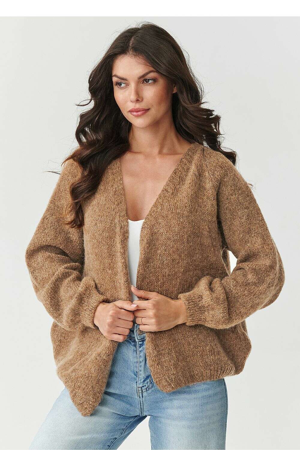 A short women's cardigan made of a luxurious blend of kid mohair, wool, polyamide, and acrylic will wrap you in pleasant warmth on cooler days. Incredibly soft, lightweight, and pleasant to the touch, yet breathable. Thanks to its classic, buttonless cut, it will be perfect for casual and elegant stylizations with a top, turtleneck, or shirt. The loose fit with slightly puffed sleeves provides comfort and freedom of movement, and the natural shine of the fibers adds exceptional elegance. Perfect as a cardigan for the office, a walk, shopping, or an evening out. It pairs well with jeans, a dress, leggings, or a skirt. An ideal choice for autumn, winter, and spring, but also works well as a cover-up on cooler summer evenings.