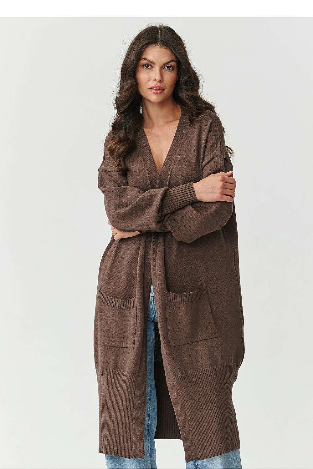 Stylish, comfortable, and timeless, that's exactly what our long women's cardigan with pockets is. It will become your favorite wardrobe piece for cooler days. Made of high-quality yarn, it combines softness, durability, and elasticity, making it perfectly fit the silhouette and providing comfort throughout the day. The long, unbuttoned cut subtly slims the figure, and the deep front pockets add both functionality and a casual character. Wide ribbing on the sleeves and bottom give the cardigan a modern finish and make it drape beautifully in motion. This is a model that you can wear for many occasions, it will work in casual stylings with jeans and a t-shirt, as a cover-up for an elegant dress, and also in office sets as a comfortable alternative to a blazer. Whether you choose classic black, trendy sandy shade, or chocolate, you will always look stylish and feel comfortable. If you are looking for a versatile oversize cardigan that combines fashionable design with practical use, this model will be an excellent choice for autumn and winter.