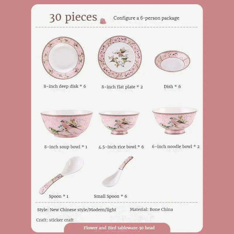 Elegant Pink Bone China Dining Ensemble: Complete 30-Piece Table Setting with Bowls, Plates, and Chopsticks