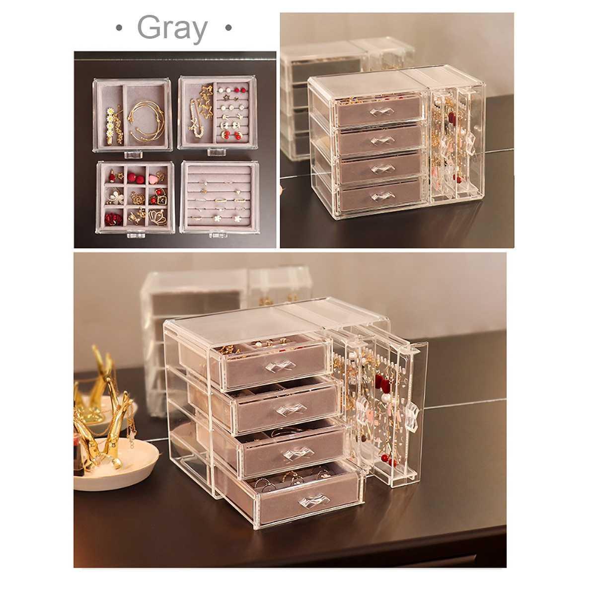 Améliorez votre rangement de bijoux avec notre boîte de rangement de bijoux en acrylique comprenant 4 tiroirs et un présentoir de boucles d'oreilles. Fabriquée en acrylique de haute qualité, cette solution de rangement permet non seulement de garder vos bijoux organisés, mais rehausse également votre espace grâce à son design élégant.