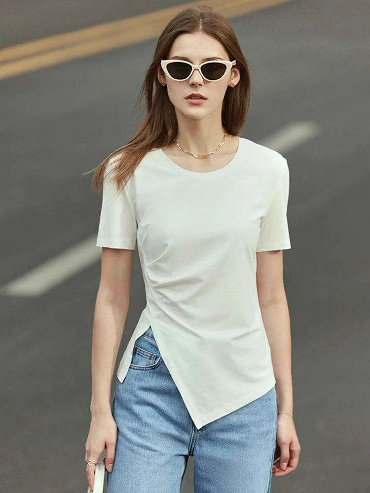 Women's Asymmetric Minimalist T-Shirt - Short Sleeve Solid Top for Spring/Summer