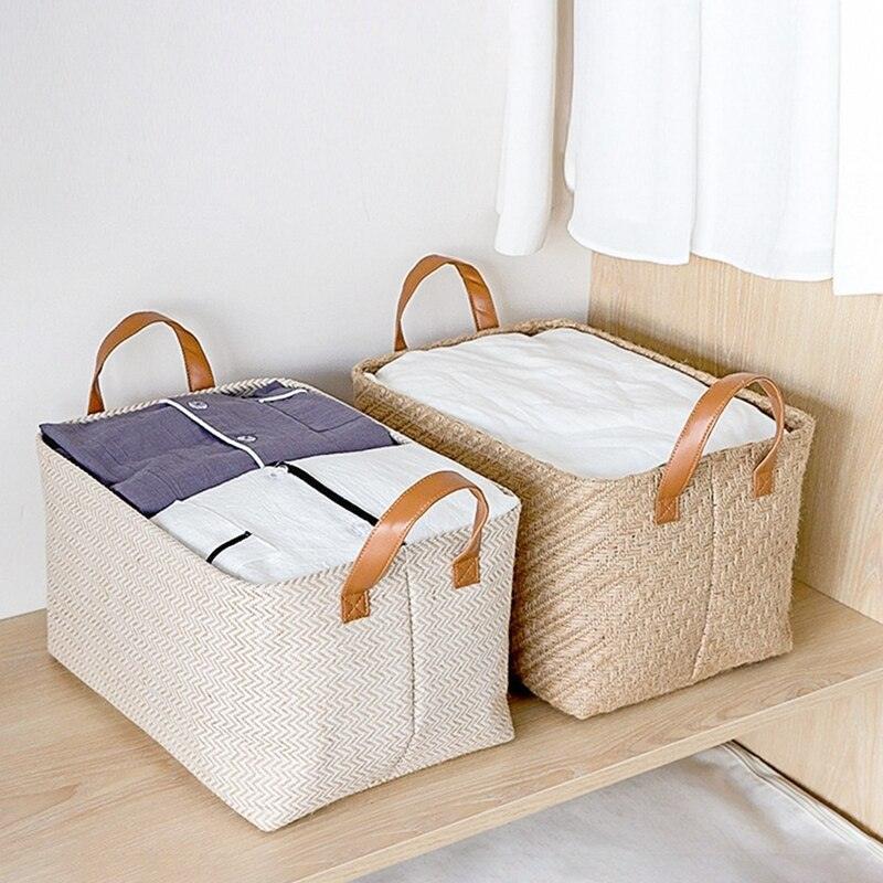 Panier de rangement en jute tissé à la main avec poignées élégantes en PU et art raffiné