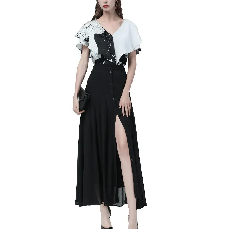 Jupe trapèze plissée sophistiquée en mousseline avec fente boutonnée séduisante