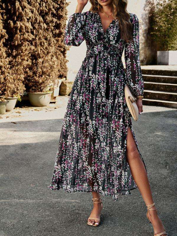 Sophisticated Long Sleeve V-Neck Chiffon Dress - Essential for Autumn-Winter