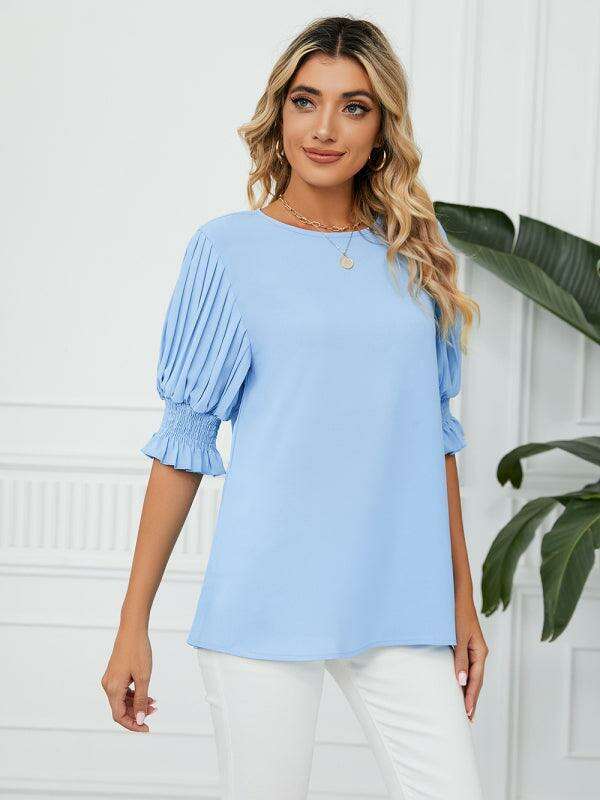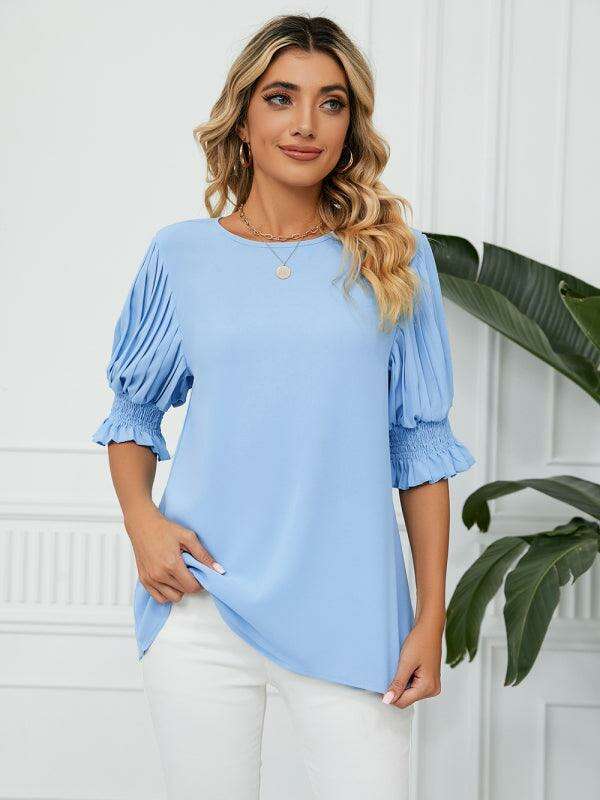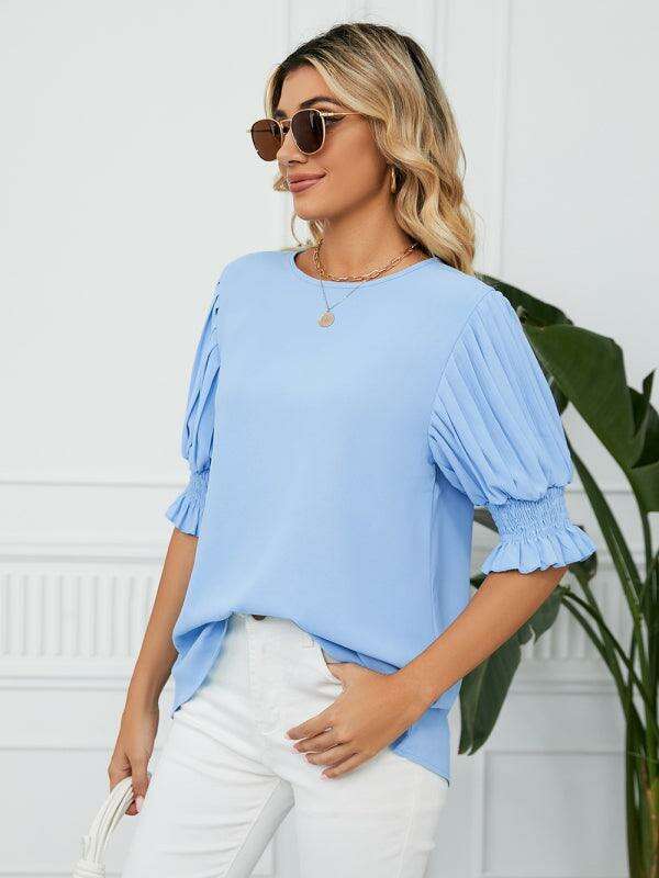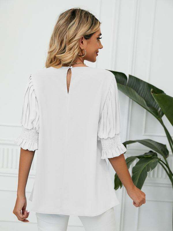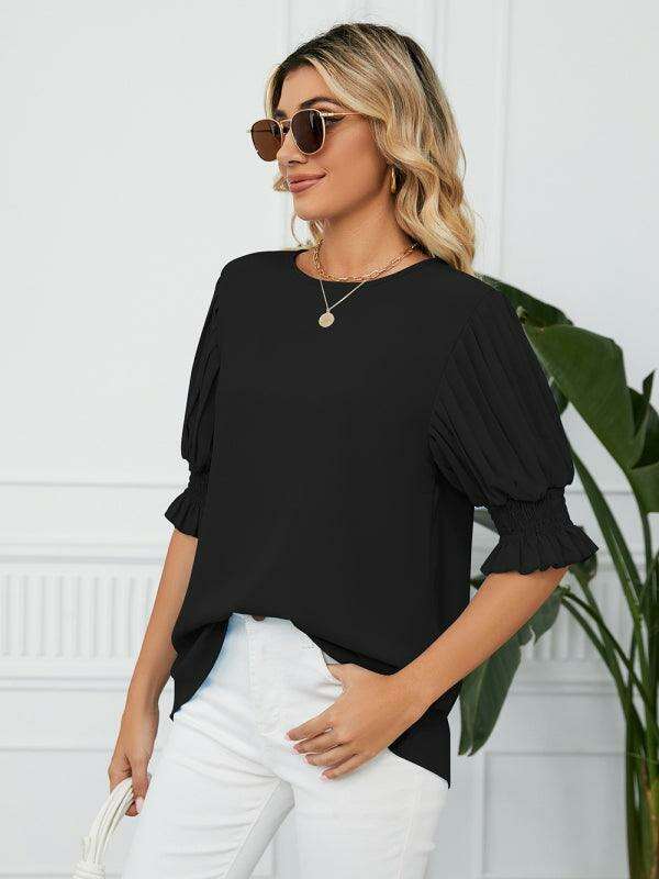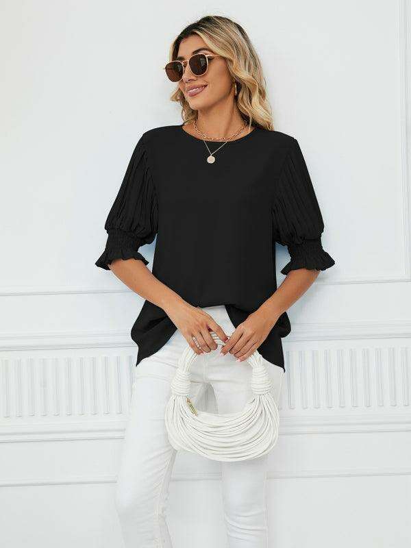 Haut à col rond et manches bouffantes de couleur unie pour femmes