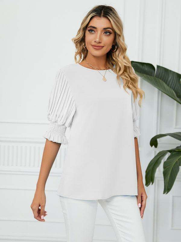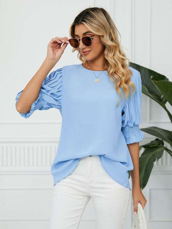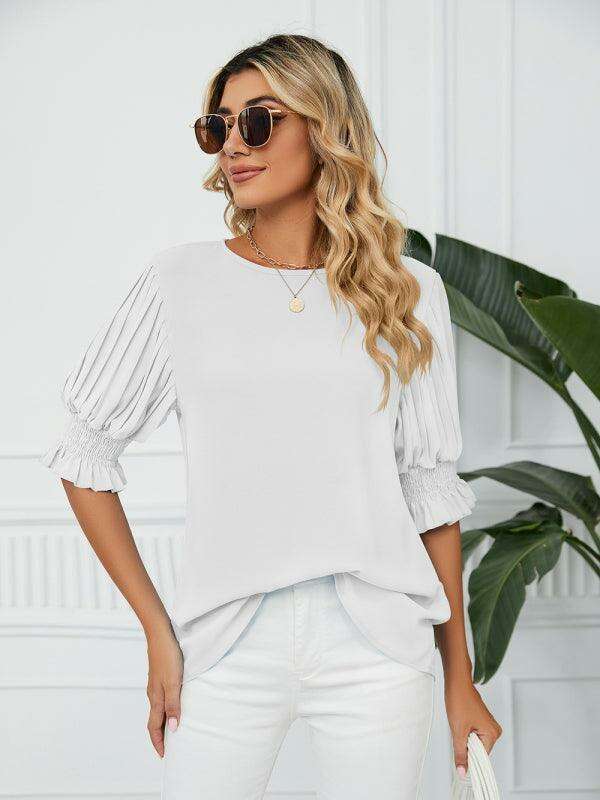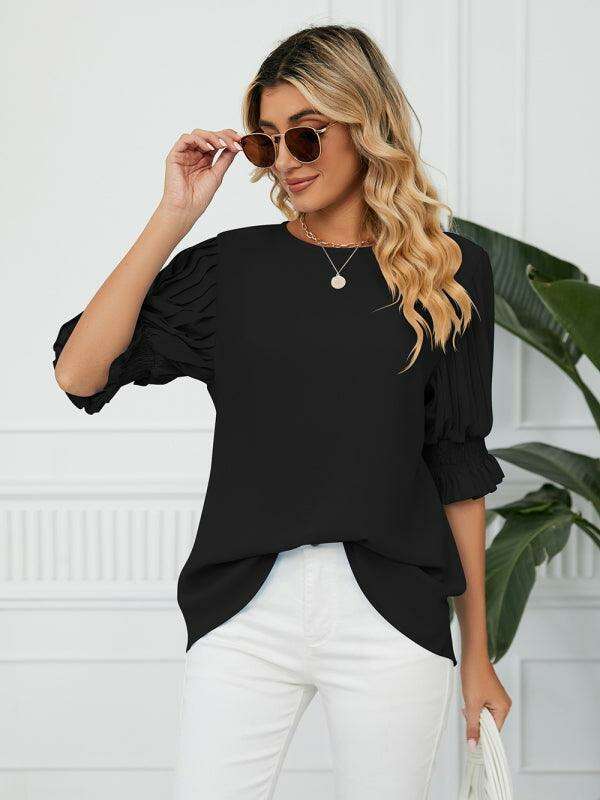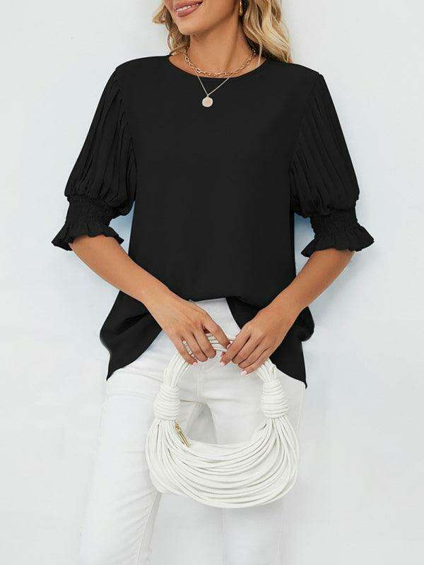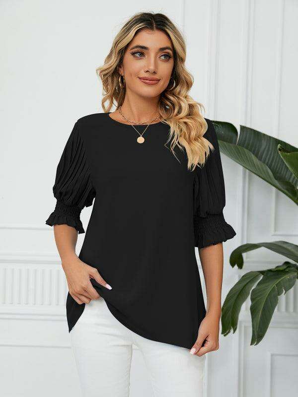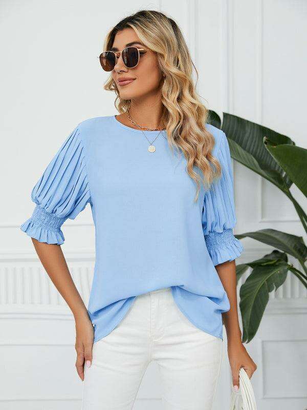 Haut à col rond et manches bouffantes de couleur unie pour femmes