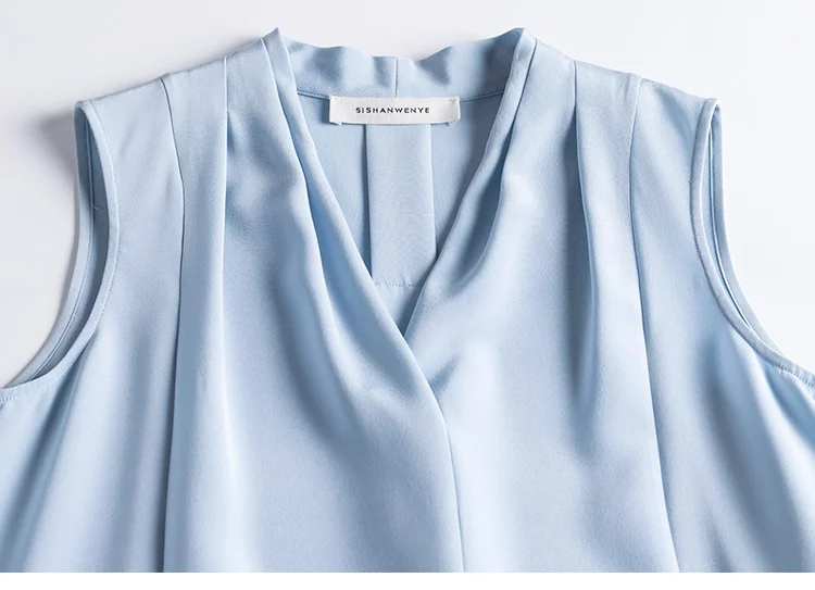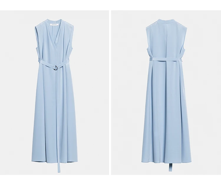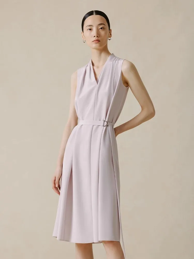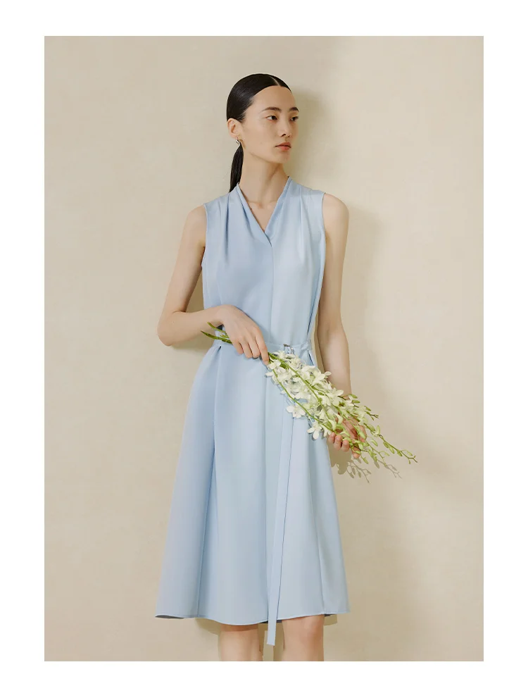 Robe en soie élégante sans manches à col en V avec ceinture plissée