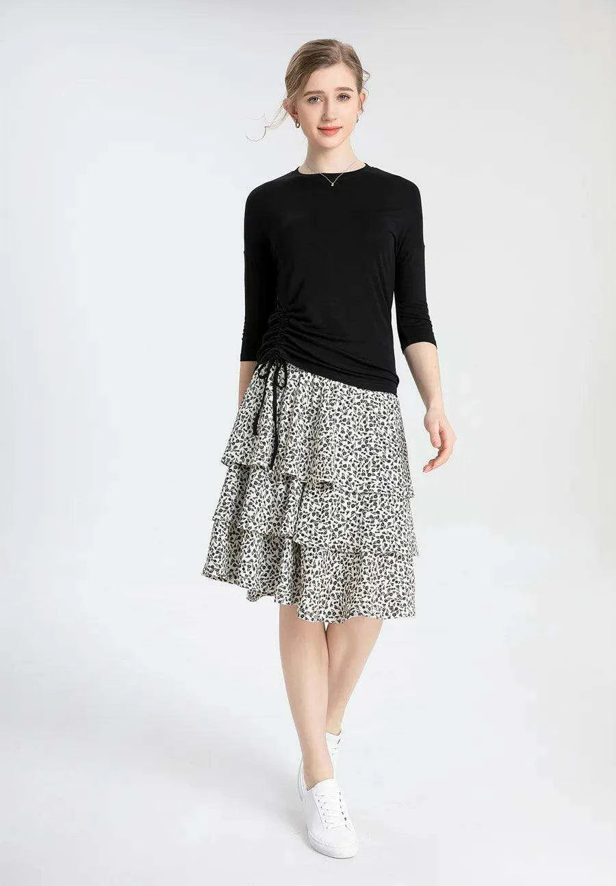 The high elastic waist guarantees a perfect fit, while the skirt length gracefully reaches just above the knee, providing ample coverage for all body types. Please note: Model is 178 cm tall and wearing size S, typically wearing sizes S-M.