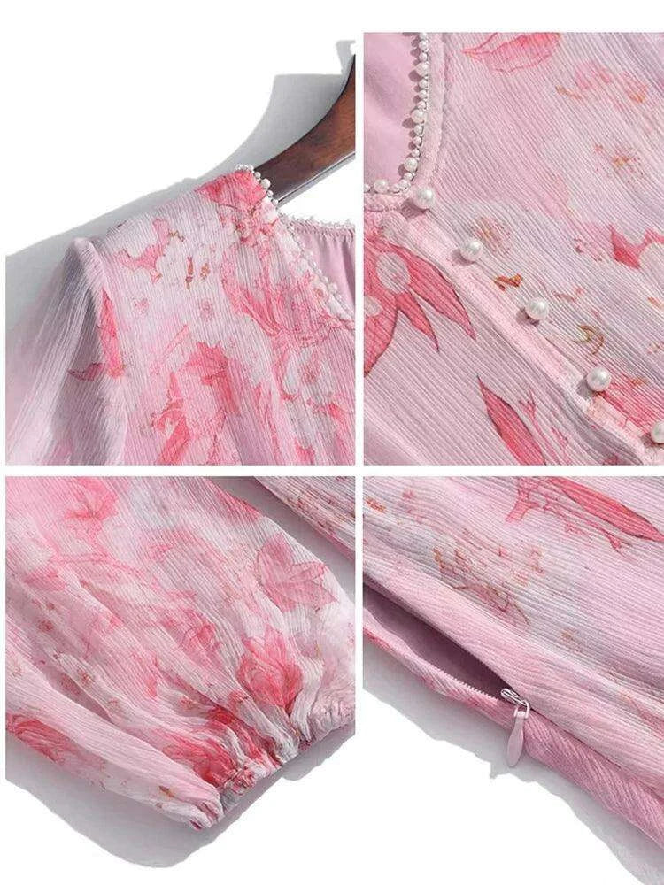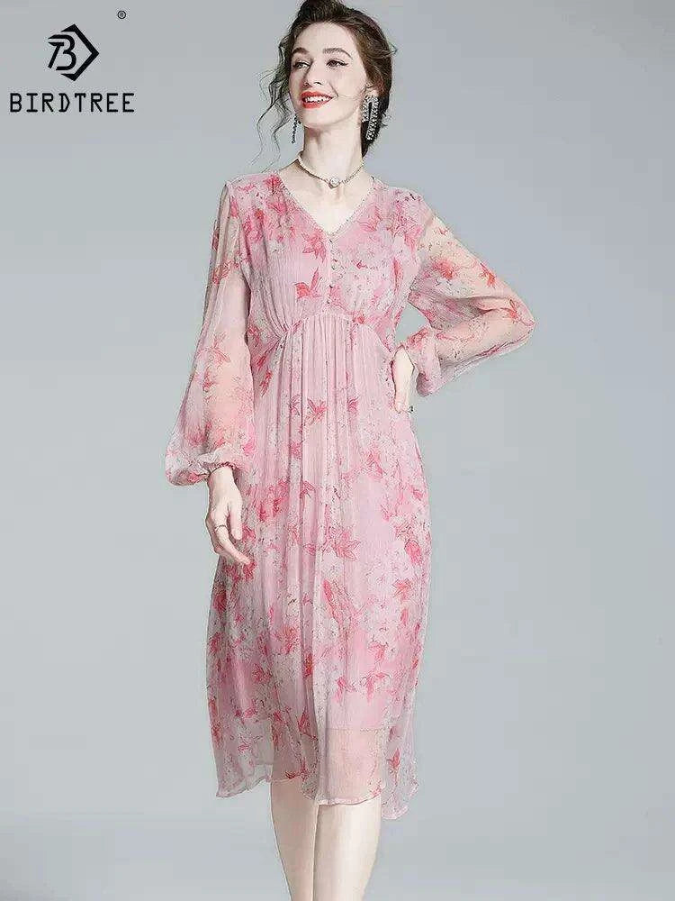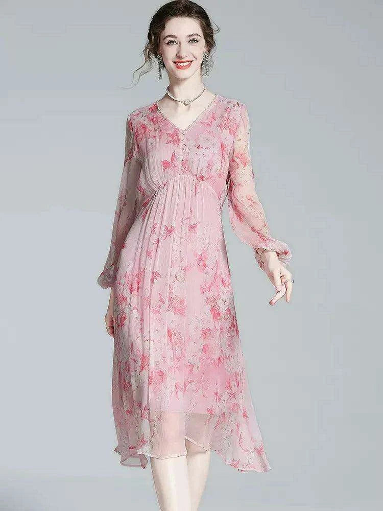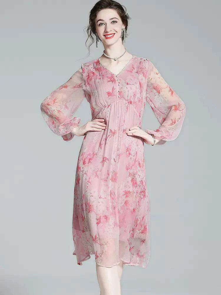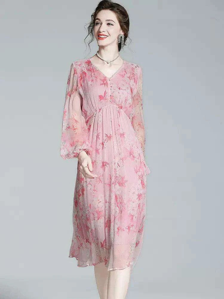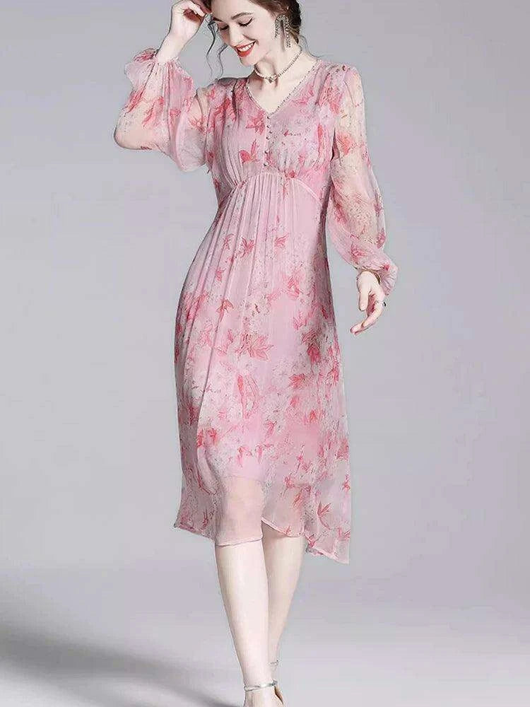 Elegant French Floral Mulberry Silk Dress with V-Neck and Puff Sleeves