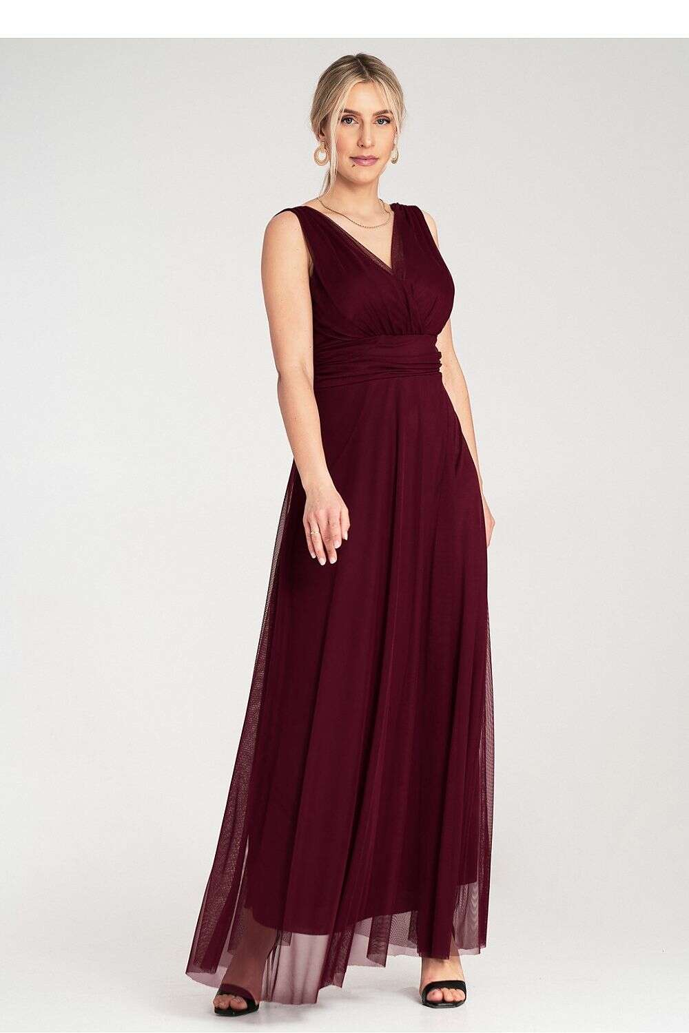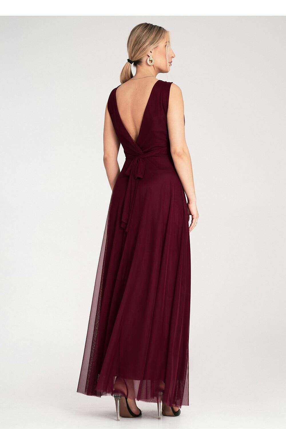 Maxi dress without sleeves with a wrap front neckline and a deep cut on the back. The top is gently gathered, with a wide band under the bust. The back is tied in a bow.