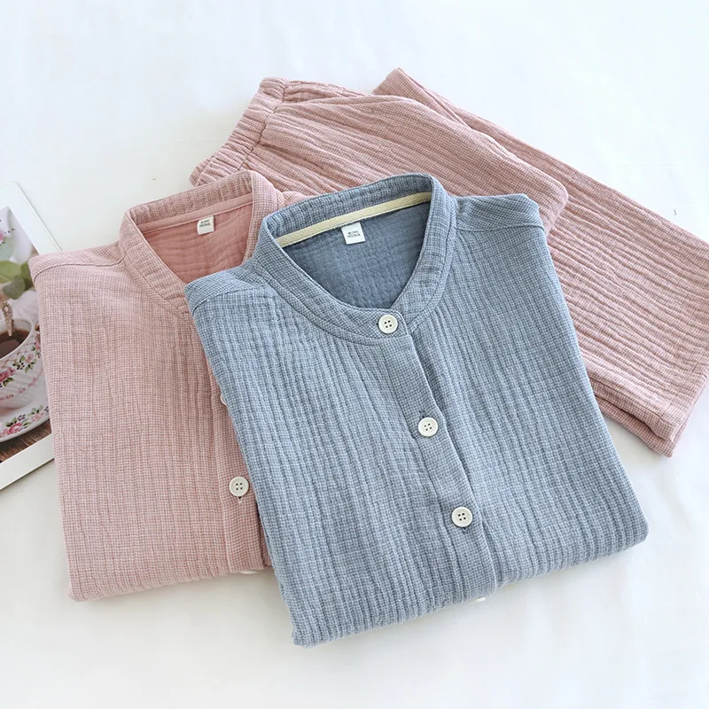 Quatre couches de gaze froissée coton Couple couleur pure pyjamas ensembles femmes hommes épaissi vêtements de nuit à manches longues pijama feminino