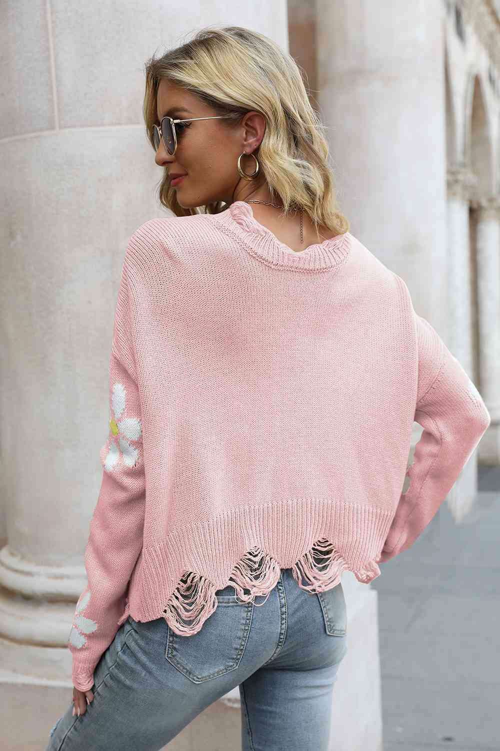 Choose the Cozy Blossom Distressed Knit Sweater for a perfect combination of style and comfort. Elevate your casual look with this essential piece in your wardrobe!
