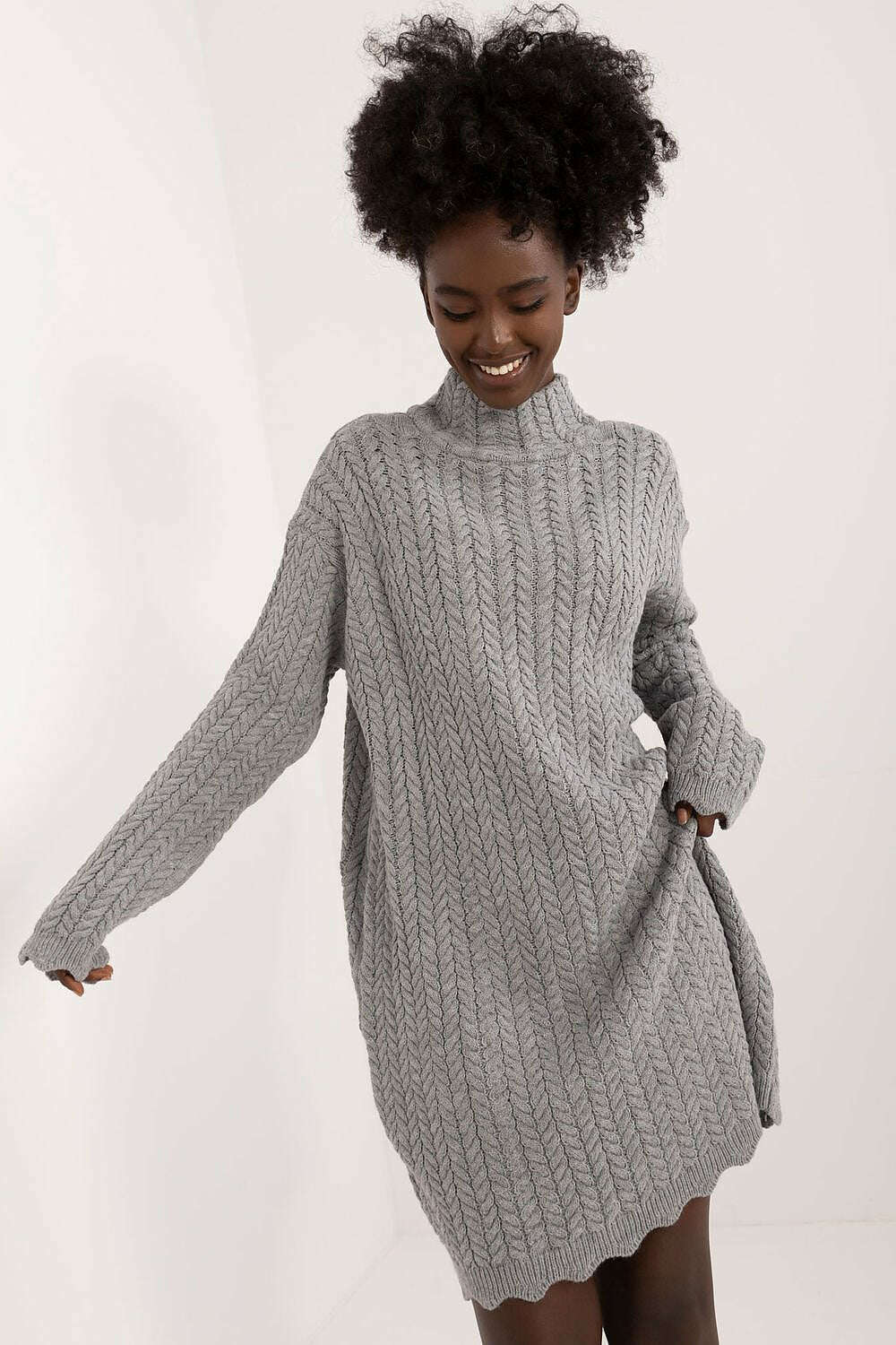 Knitted mini dress with a turtleneck, made of a soft blend of acrylic and wool, perfect for everyday wear. It has long sleeves that provide warmth and comfort on colder days. The varied texture of the weave adds distinctiveness and a unique character to the dress. The casual style makes the dress a great choice for everyday outings, combining comfort with a fashionable and elegant look.