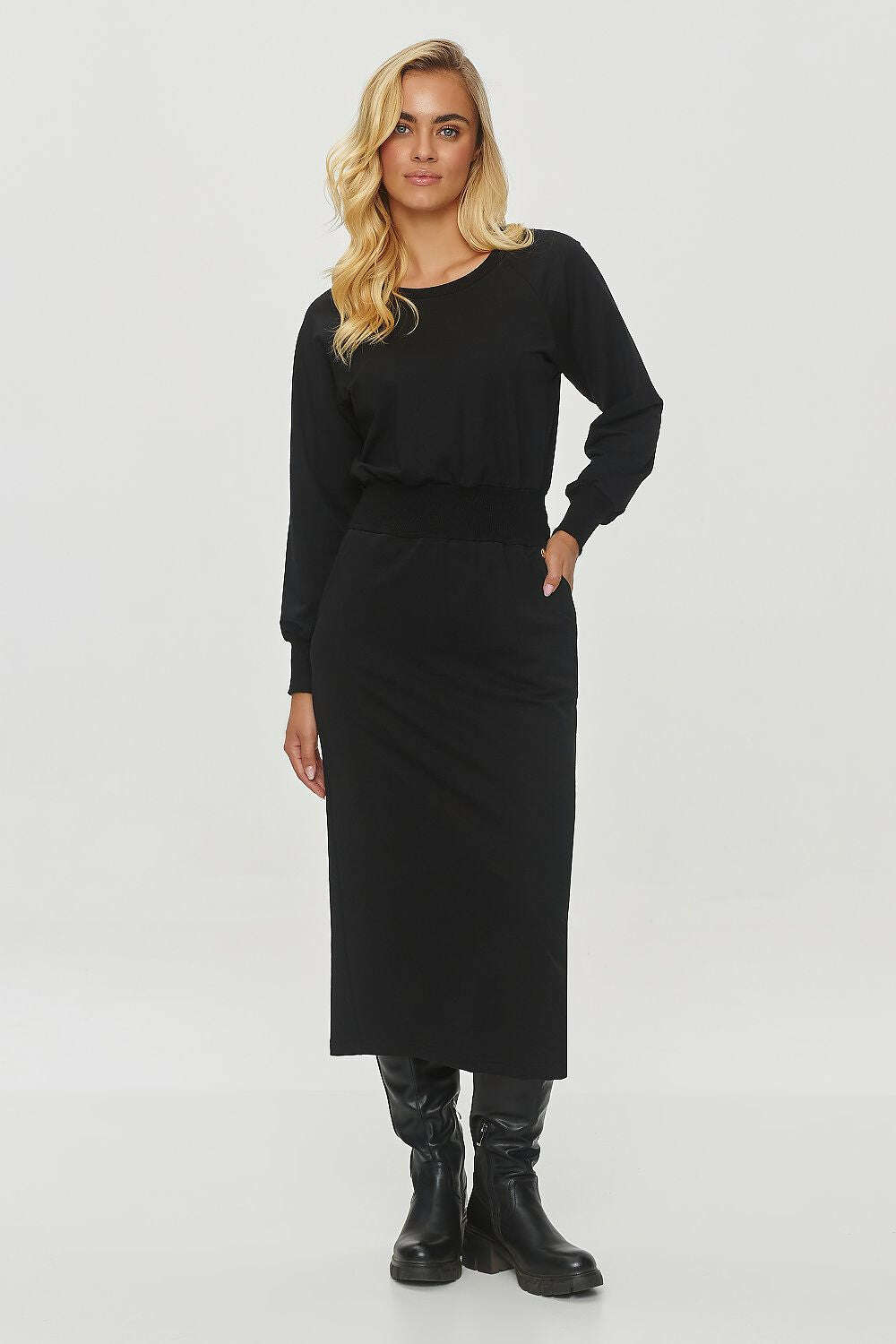 A sweatshirt dress is a casual midi-length creation, perfect for everyday wear. It has a loose cut in the upper part, and long raglan sleeves emphasize the relaxed and sporty character. The neckline is rounded, simple, and subtle, which fits the overall minimalist style of the dress. There is a wide, elastic waistband that emphasizes the silhouette, adding a feminine touch to this simple design. The bottom of the dress is straight, pencil-cut, reaching the knee. This cut ensures comfort while emphasizing the feminine silhouette. There are practical pockets on the sides, making it functional and comfortable. The dress is versatile and comfortable, perfect for everyday outings. It combines sporty casualness with elegant minimalism, making it an ideal choice for various occasions, both for work and social gatherings.