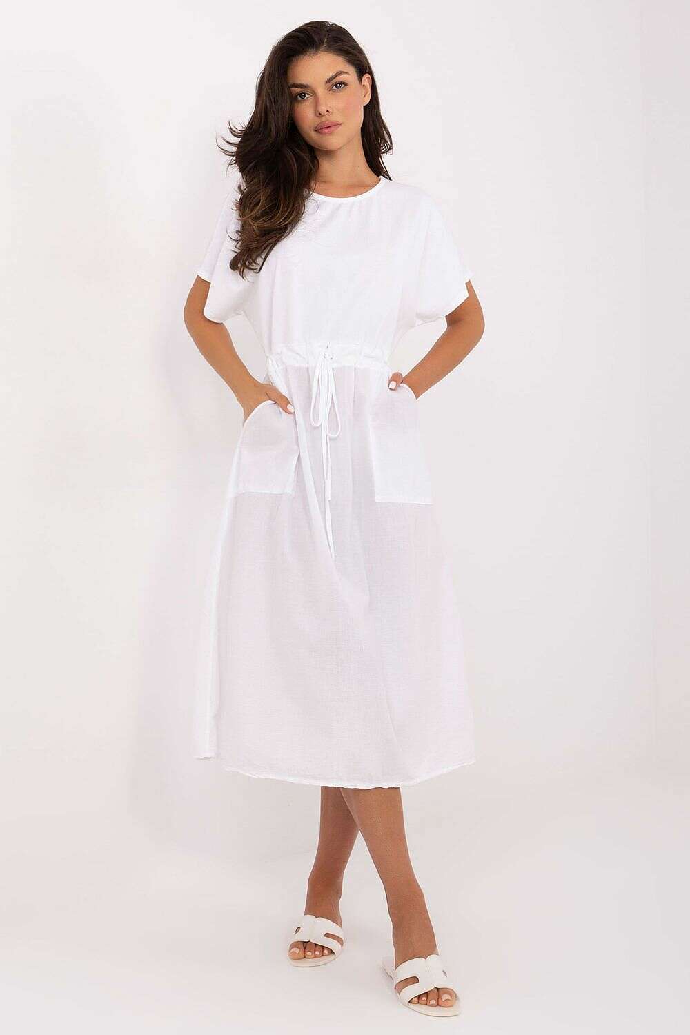 Light and comfortable summer dress with a flared cut, made of natural cotton. Smooth fabric provides comfort and works great in everyday stylizations. The model is midi length, with short sleeves and a classic, round neckline. There is a tie at the waist, which allows you to emphasize the silhouette and adjust the dress to the figure. An additional advantage are practical, slip-in pockets that add functionality and ease. It is an ideal proposal for summer days for a walk, shopping, work or meeting friends. Universal and timeless, it will be a great base for many stylizations.
