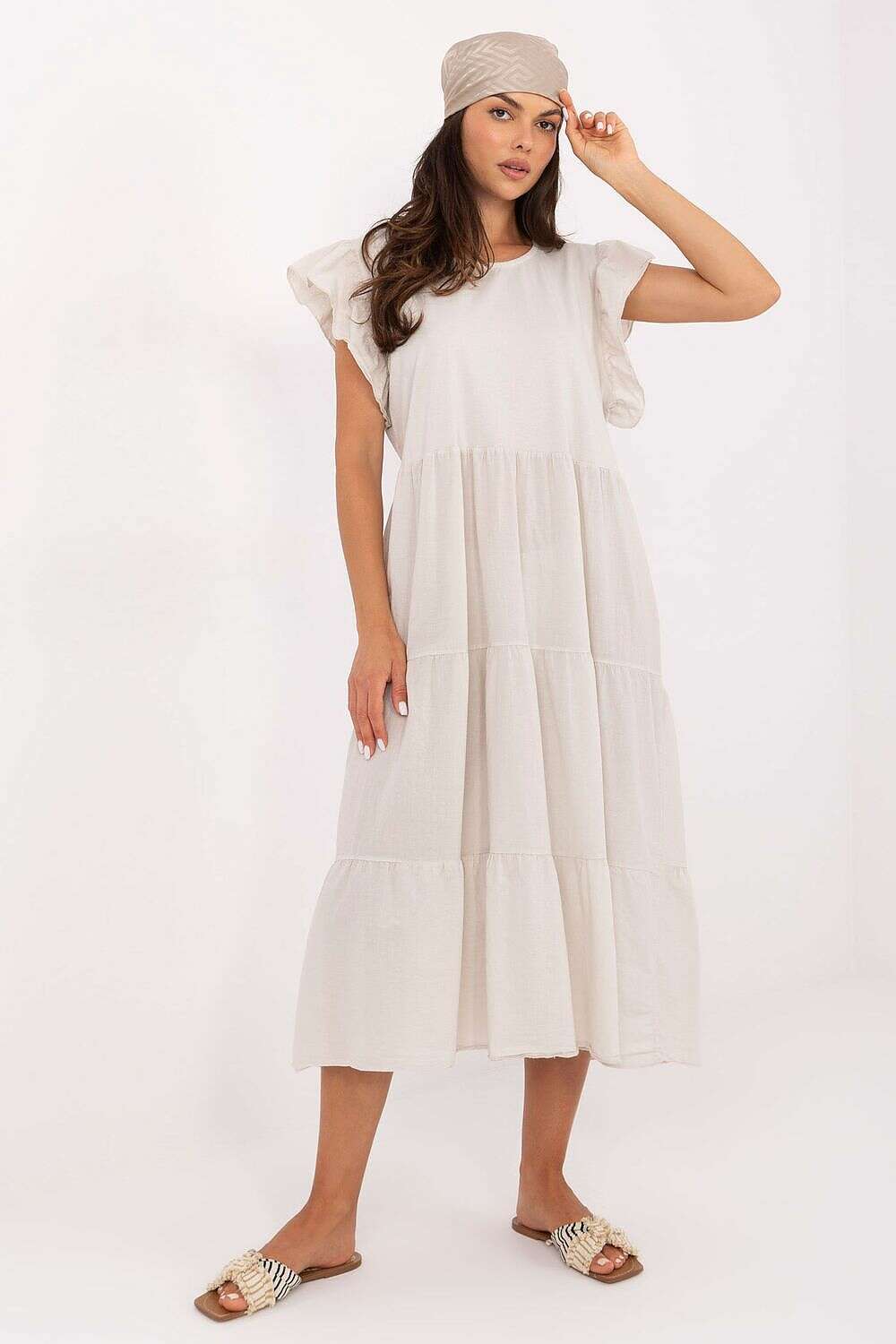 Loose, comfortable and stylish, this oversize cotton dress is the perfect choice for everyday summer outfits. Made of natural, breathable fabric, it ensures freedom of movement and comfort throughout the day. The midi-length model is made of smooth material, with a round neckline and short sleeves finished with a delicate frill that adds a feminine touch. The back of the dress is decorated with a subtle tie at the back, giving the whole a slightly romantic character. The dress will work great for everyday wear, for shopping, a walk, or a meeting with friends. Stylish in its simplicity, it will be an excellent base for many summer looks.
