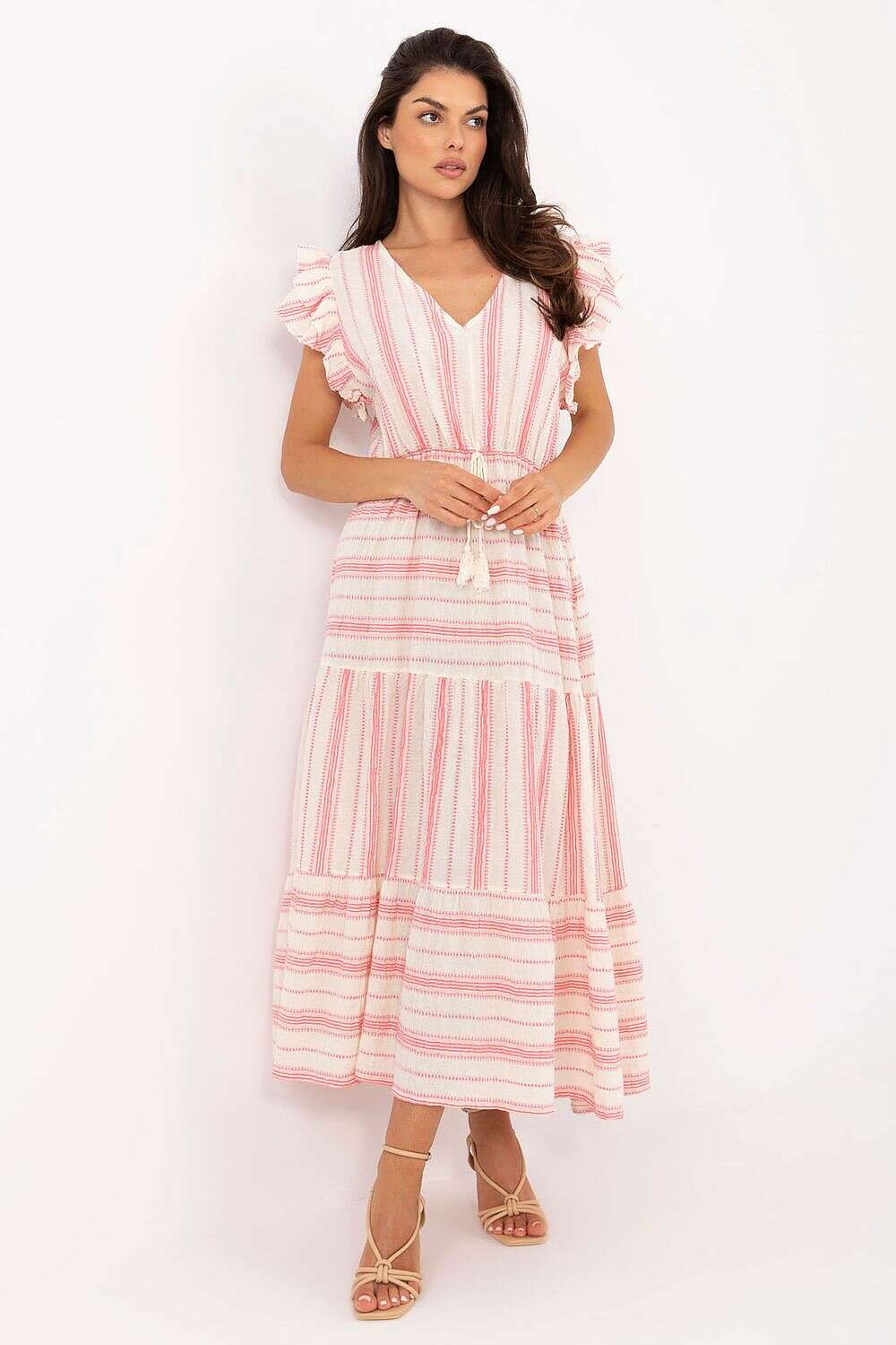 Stylish boho dress, perfect for summer days. Made of breathable, natural cotton, it guarantees comfort even in the hottest weather. A flared cut with a midi length beautifully shapes the silhouette and emphasizes femininity, while the waist tie allows for individual adjustment. The dress has a sweetheart neckline, which slims the neck and adds lightness, and short ruffled sleeves, giving it a girlish charm. The material is adorned with subtle embroidery, emphasizing its boho character. The model is put on over the head without fastening. It will work perfectly for everyday wear, for a walk, shopping or meeting friends. An ideal proposition for women who value style and comfort in a summer edition.