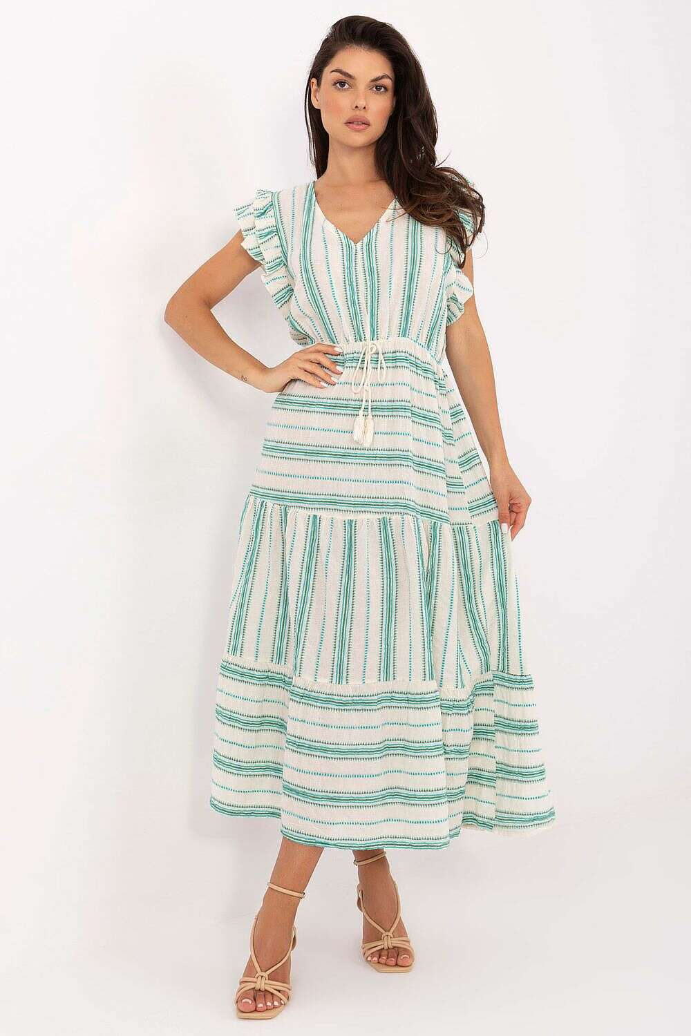Stylish boho dress, perfect for summer days. Made of breathable, natural cotton, it guarantees comfort even in the hottest weather. The flared cut with a midi length beautifully complements the silhouette and emphasizes femininity, while the waist tie allows for individual adjustment. The dress has a sweetheart neckline, which slims the neck and adds lightness, as well as short ruffled sleeves, giving it a girlish charm. The material is adorned with subtle embroidery, emphasizing its boho character. The model is put on over the head without fastening. It will work perfectly for everyday walks, shopping, or meeting friends. It is an ideal proposal for women who appreciate style and comfort in a summer edition.